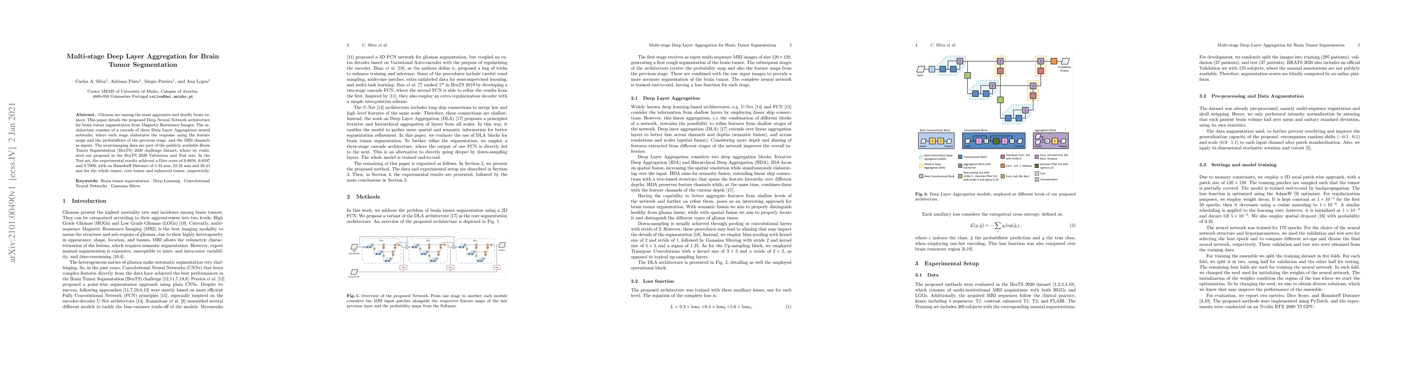Gliomas are among the most aggressive and deadly brain tumors. This paper details the proposed Deep Neural Network architecture for brain tumor segmentation from Magnetic Resonance Images. The architecture consists of a cascade of three Deep Layer Aggregation neural networks, where each stage elaborates the response using the feature maps and the probabilities of the previous stage, and the MRI channels as inputs. The neuroimaging data are part of the publicly available Brain Tumor Segmentation (BraTS) 2020 challenge dataset, where we evaluated our proposal in the BraTS 2020 Validation and Test sets. In the Test set, the experimental results achieved a Dice score of 0.8858, 0.8297 and 0.7900, with an Hausdorff Distance of 5.32 mm, 22.32 mm and 20.44 mm for the whole tumor, core tumor and enhanced tumor, respectively.