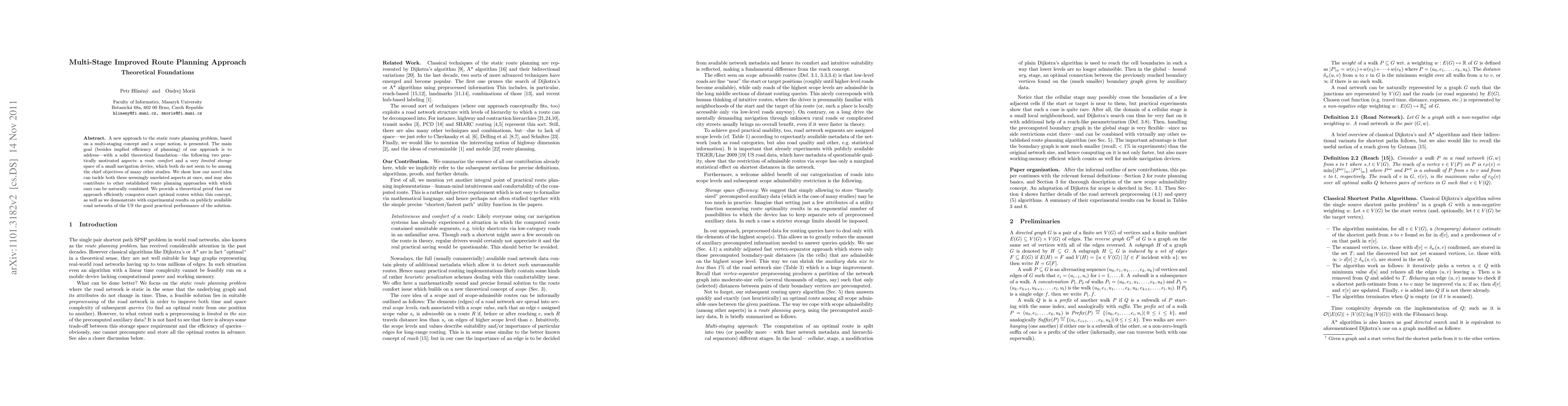 A new approach to the static route planning problem, based on a multi-staging concept and a \emph{scope} notion, is presented. The main goal (besides implied efficiency of planning) of our approach is to address---with a solid theoretical foundation---the following two practically motivated aspects: a \emph{route comfort} and a very \emph{limited storage} space of a small navigation device, which both do not seem to be among the chief objectives of many other studies. We show how our novel idea can tackle both these seemingly unrelated aspects at once, and may also contribute to other established route planning approaches with which ours can be naturally combined. We provide a theoretical proof that our approach efficiently computes exact optimal routes within this concept, as well as we demonstrate with experimental results on publicly available road networks of the US the good practical performance of the solution.