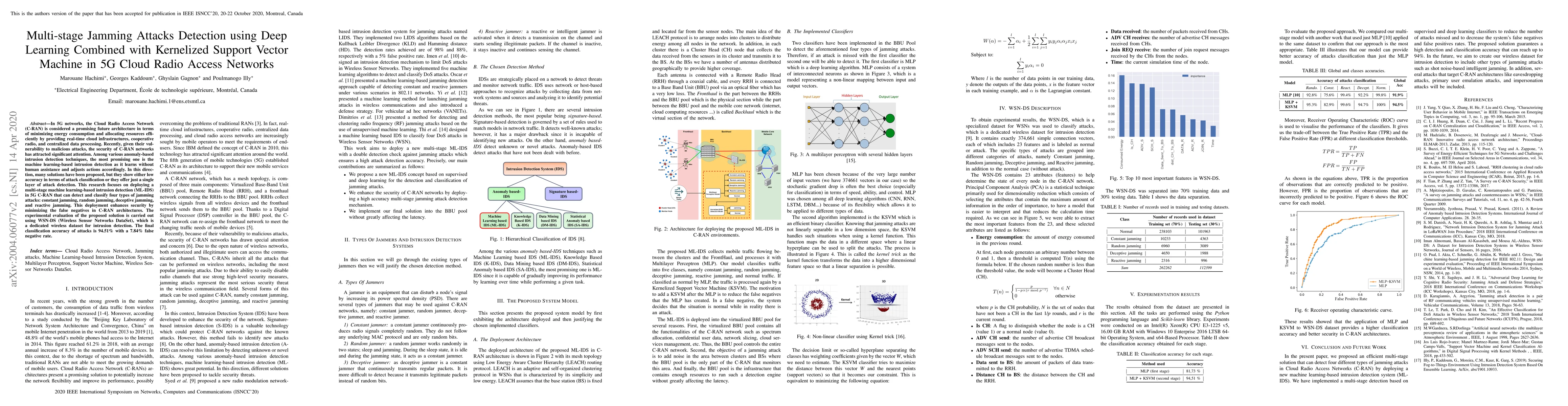 This research proposes a multi-stage machine learning-based intrusion detection system (ML-IDS) for 5G Cloud Radio Access Networks (C-RAN) to detect and classify four types of jamming attacks, achieving 94.51% accuracy and a 7.84% false negative rate. The system combines deep learning with kernelized support vector machines to enhance security and minimize false negatives.