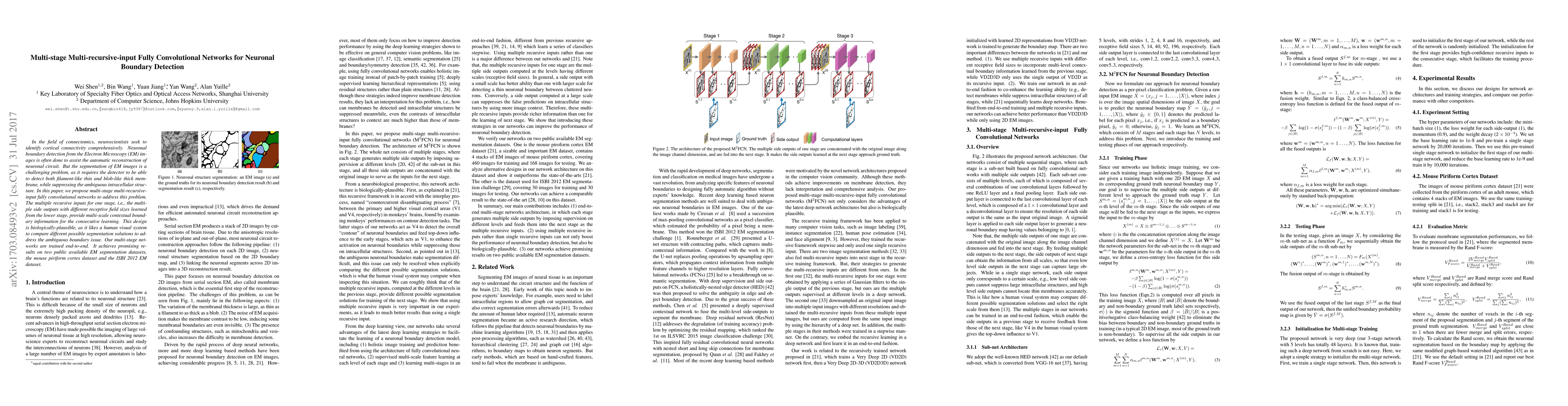 This paper proposes multi-stage multi-recursive-input fully convolutional networks for neuronal boundary detection in Electron Microscopy images, addressing the challenge of segmenting both thin and thick membranes while suppressing ambiguous intracellular structures. The method achieves promising results on public EM datasets by leveraging multi-scale contextual information through recursive inputs.