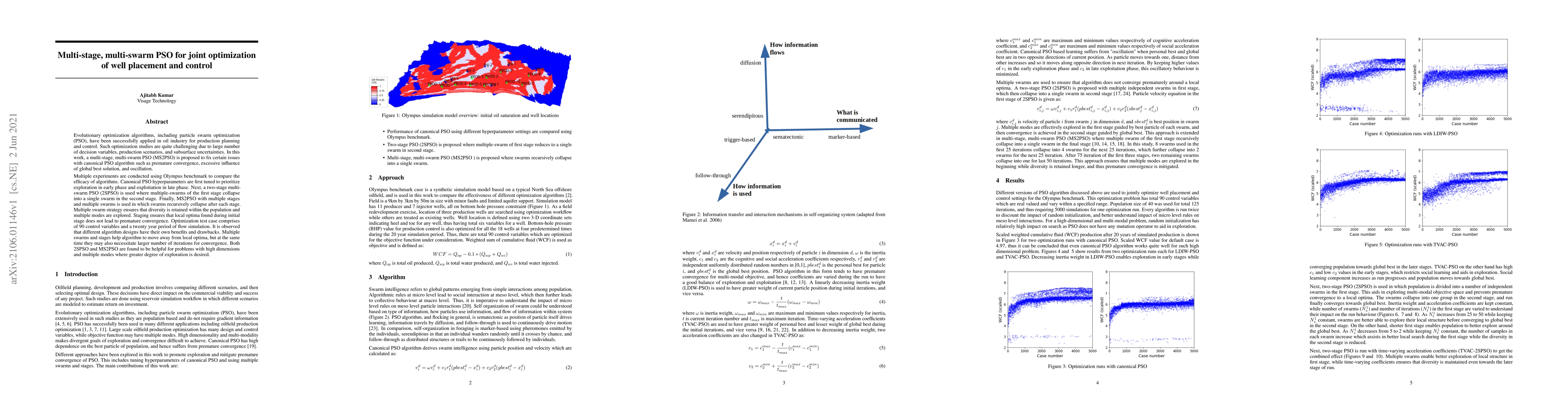 Evolutionary optimization algorithms, including particle swarm optimization (PSO), have been successfully applied in oil industry for production planning and control. Such optimization studies are quite challenging due to large number of decision variables, production scenarios, and subsurface uncertainties. In this work, a multi-stage, multi-swarm PSO (MS2PSO) is proposed to fix certain issues with canonical PSO algorithm such as premature convergence, excessive influence of global best solution, and oscillation. Multiple experiments are conducted using Olympus benchmark to compare the efficacy of algorithms. Canonical PSO hyperparameters are first tuned to prioritize exploration in early phase and exploitation in late phase. Next, a two-stage multi-swarm PSO (2SPSO) is used where multiple-swarms of the first stage collapse into a single swarm in the second stage. Finally, MS2PSO with multiple stages and multiple swarms is used in which swarms recursively collapse after each stage. Multiple swarm strategy ensures that diversity is retained within the population and multiple modes are explored. Staging ensures that local optima found during initial stage does not lead to premature convergence. Optimization test case comprises of 90 control variables and a twenty year period of flow simulation. It is observed that different algorithm designs have their own benefits and drawbacks. Multiple swarms and stages help algorithm to move away from local optima, but at the same time they may also necessitate larger number of iterations for convergence. Both 2SPSO and MS2PSO are found to be helpful for problems with high dimensions and multiple modes where greater degree of exploration is desired.