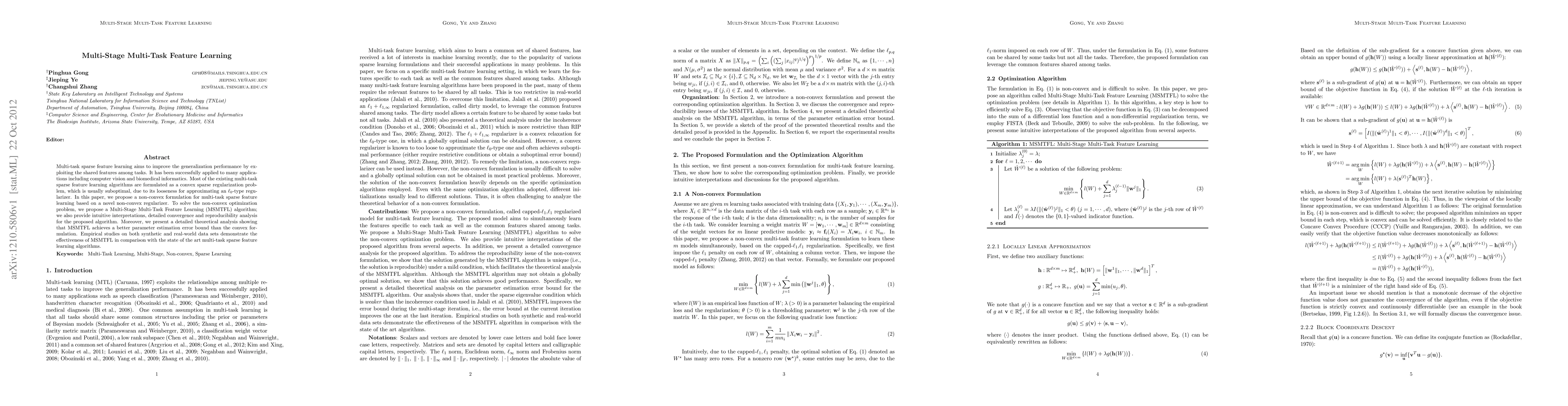 A novel multi-task feature learning approach is proposed, combining sparse recovery techniques with a novel regularization method.