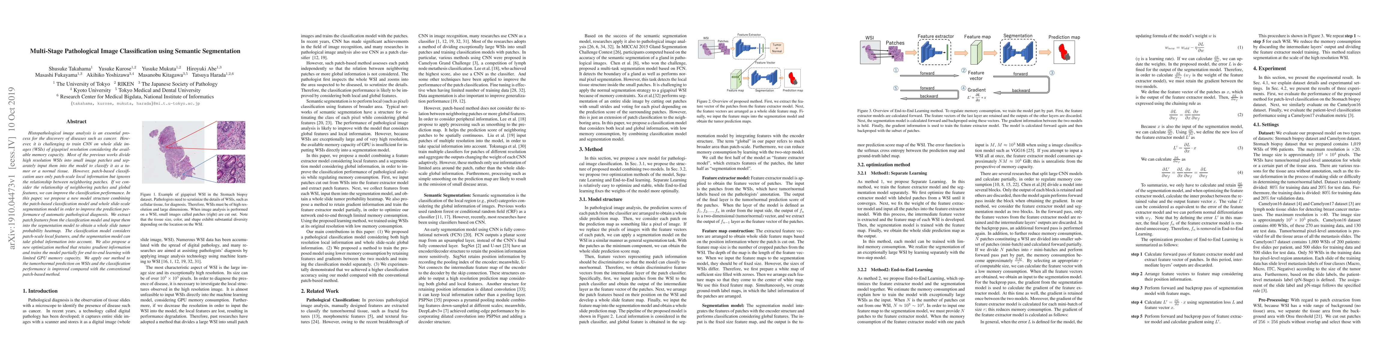 Histopathological image analysis is an essential process for the discovery of diseases such as cancer. However, it is challenging to train CNN on whole slide images (WSIs) of gigapixel resolution considering the available memory capacity. Most of the previous works divide high resolution WSIs into small image patches and separately input them into the model to classify it as a tumor or a normal tissue. However, patch-based classification uses only patch-scale local information but ignores the relationship between neighboring patches. If we consider the relationship of neighboring patches and global features, we can improve the classification performance. In this paper, we propose a new model structure combining the patch-based classification model and whole slide-scale segmentation model in order to improve the prediction performance of automatic pathological diagnosis. We extract patch features from the classification model and input them into the segmentation model to obtain a whole slide tumor probability heatmap. The classification model considers patch-scale local features, and the segmentation model can take global information into account. We also propose a new optimization method that retains gradient information and trains the model partially for end-to-end learning with limited GPU memory capacity. We apply our method to the tumor/normal prediction on WSIs and the classification performance is improved compared with the conventional patch-based method.