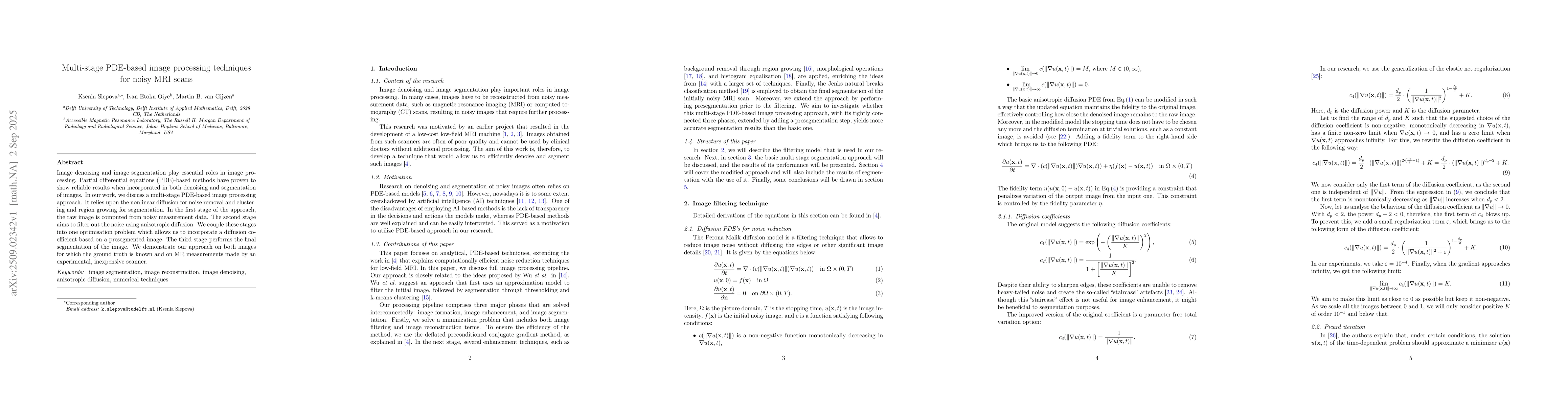 Image denoising and image segmentation play essential roles in image processing. Partial differential equations (PDE)-based methods have proven to show reliable results when incorporated in both denoising and segmentation of images. In our work, we discuss a multi-stage PDE-based image processing approach. It relies upon the nonlinear diffusion for noise removal and clustering and region growing for segmentation. In the first stage of the approach, the raw image is computed from noisy measurement data. The second stage aims to filter out the noise using anisotropic diffusion. We couple these stages into one optimisation problem which allows us to incorporate a diffusion coefficient based on a presegmented image. The third stage performs the final segmentation of the image. We demonstrate our approach on both images for which the ground truth is known and on MR measurements made by an experimental, inexpensive scanner.