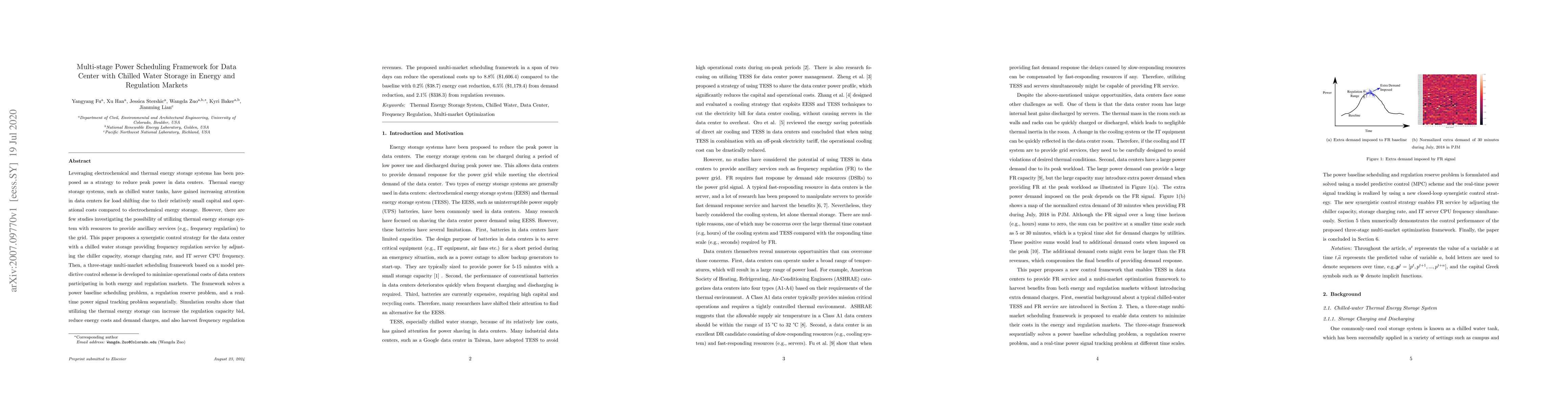 This paper proposes a multi-stage power scheduling framework for data centers utilizing chilled water storage to reduce peak power and provide frequency regulation services. The framework minimizes operational costs through a three-stage model predictive control scheme in energy and regulation markets, achieving up to 8.8% total cost reduction.