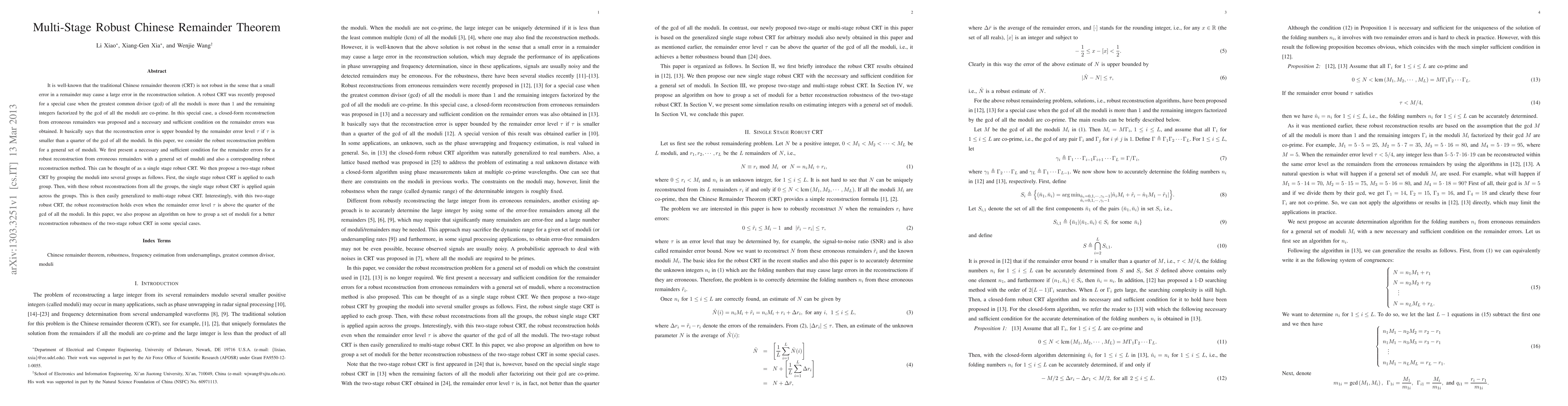 This paper proposes a multi-stage robust Chinese Remainder Theorem (CRT) to address errors in remainders, presenting a necessary and sufficient condition for robust reconstruction with general moduli. The two-stage approach enhances robustness even when error levels exceed a quarter of the gcd of all moduli, along with an algorithm for optimal modulus grouping.