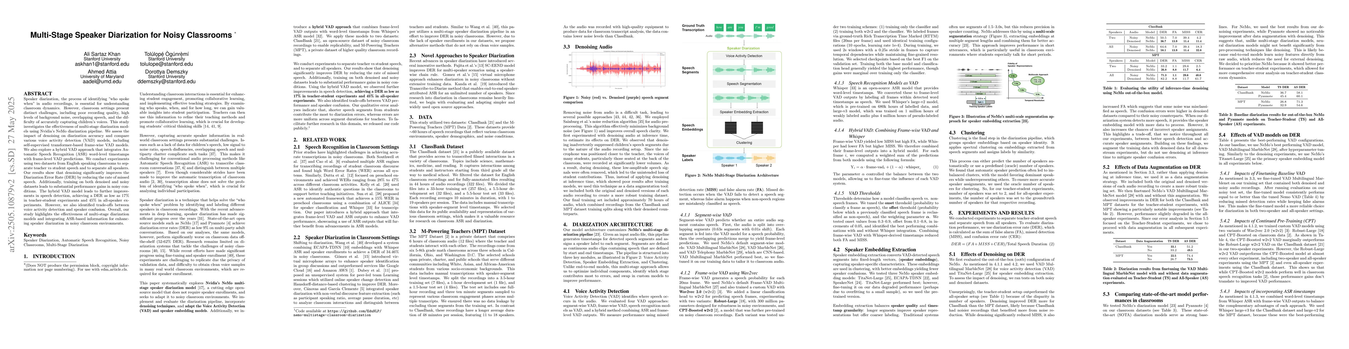 The paper presents a multi-stage diarization approach using Nvidia's NeMo, incorporating denoising and hybrid VAD models for improved accuracy in noisy classroom settings.