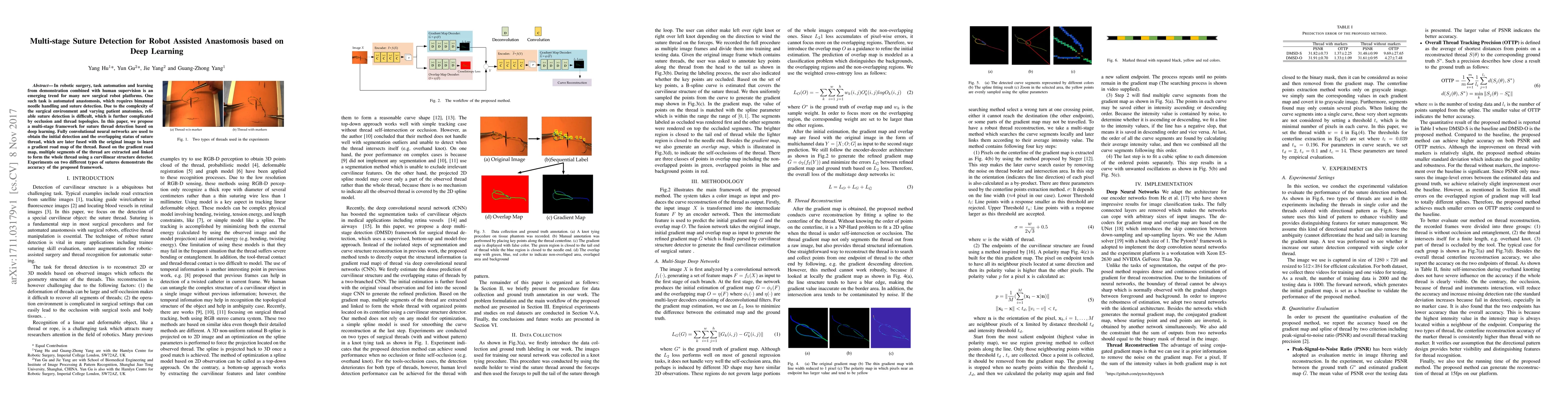 This paper proposes a multi-stage deep learning framework for detecting suture threads in robot-assisted anastomosis, utilizing fully convolutional neural networks for initial detection and a gradient road map for thread linking. The method demonstrates accuracy in identifying and linking multiple segments of suture threads in complex surgical environments.