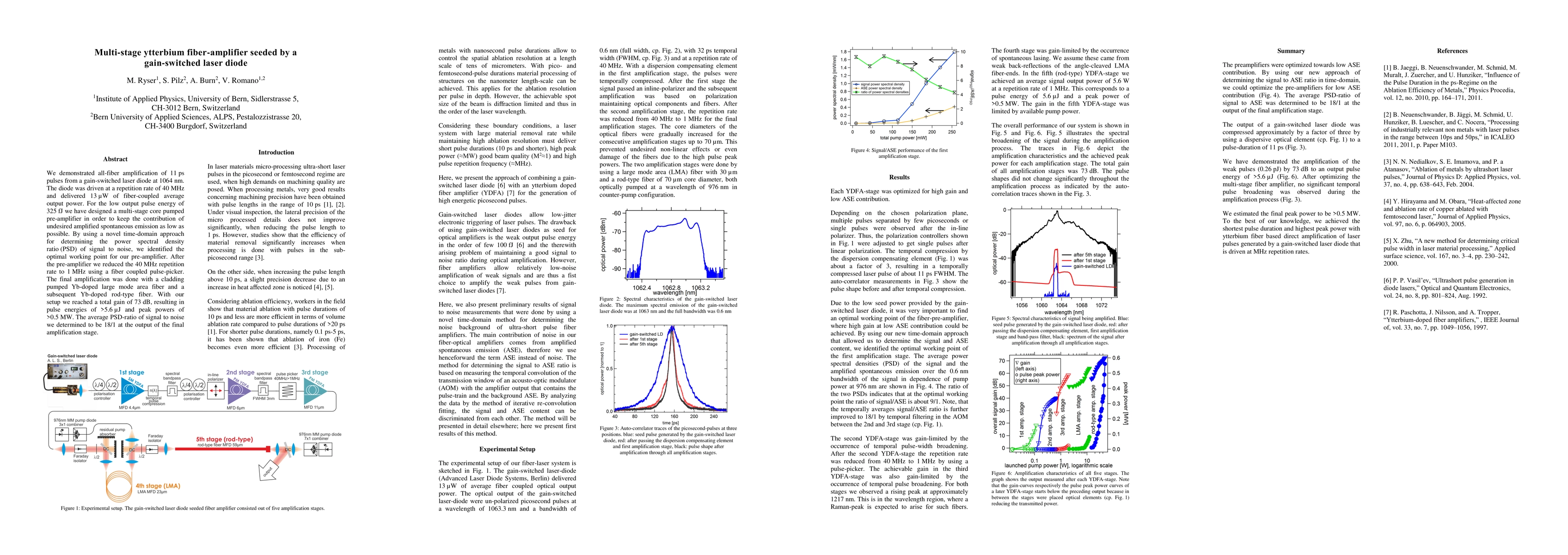 This paper details the development of a multi-stage ytterbium fiber amplifier system that boosts 11 ps pulses from a gain-switched laser diode at 1064 nm, achieving a total gain of 73 dB and pulse energies exceeding 5.6 µJ. The system employs a novel time-domain approach to optimize the pre-amplifier's performance and minimize noise.