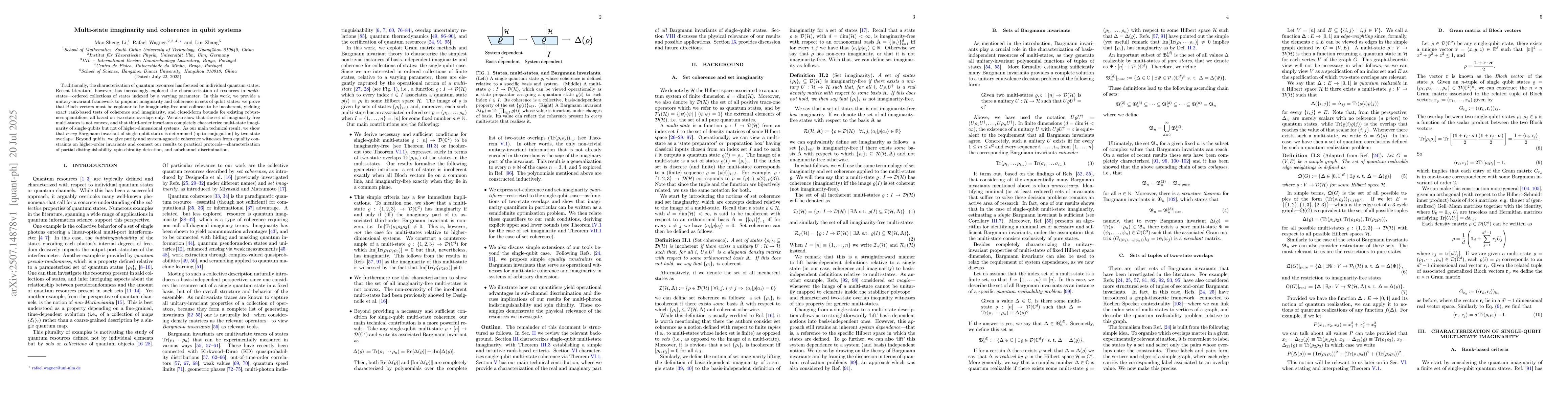 Traditionally, the characterization of quantum resources has focused on individual quantum states. Recent literature, however, has increasingly explored the characterization of resources in multi-states (ordered collections of states indexed by a varying parameter). In this work, we provide a unitary-invariant framework to pinpoint imaginarity and coherence in sets of qubit states: we prove that Bloch vectors must be coplanar to be imaginarity-free and colinear to be incoherent, yielding exact rank-based tests of coherence and imaginarity, and closed-form bounds for existing robustness quantifiers, all based on two-state overlaps only. We also show that the set of imaginarity-free multi-states is not convex, and that third-order invariants completely characterize multi-state imaginarity of single-qubits but not of higher-dimensional systems. As our main technical result, we show that every Bargmann invariant of single-qubit states is determined (up to conjugation) by two-state overlaps. Beyond qubits, we give purity and system-agnostic coherence witnesses from equality constraints on higher-order invariants and connect our results to practical protocols: characterization of partial distinguishability, spin-chirality detection, and subchannel discrimination.