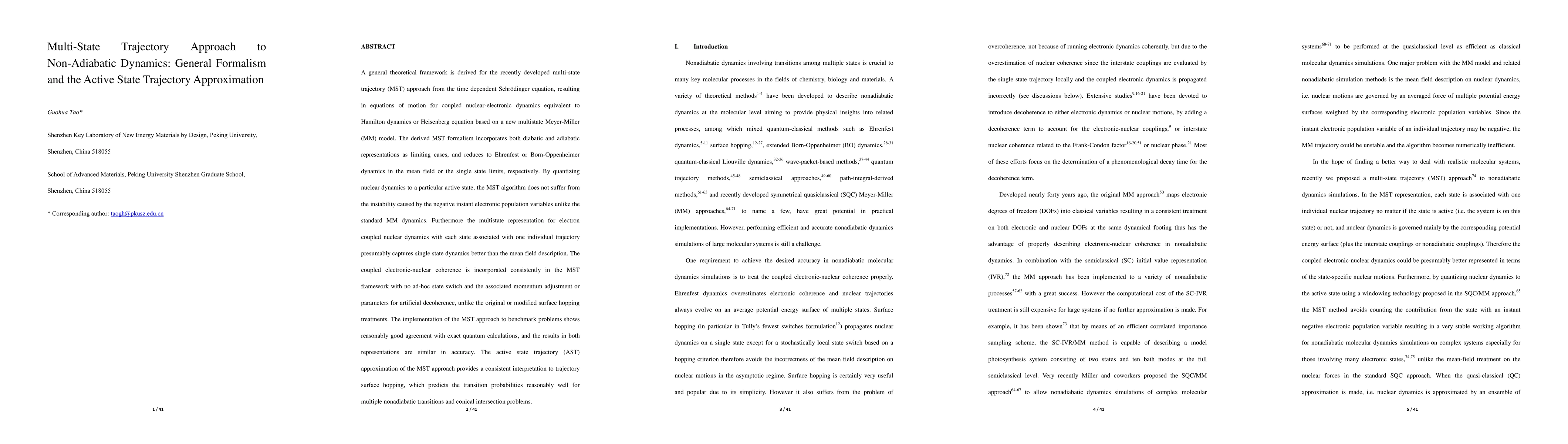 The paper presents a general theoretical framework for the multi-state trajectory (MST) approach, deriving equations of motion for coupled nuclear-electronic dynamics based on a new multistate Meyer-Miller model. The MST formalism incorporates both diabatic and adiabatic dynamics and avoids instability issues found in standard MM dynamics by focusing on an active state trajectory approximation.