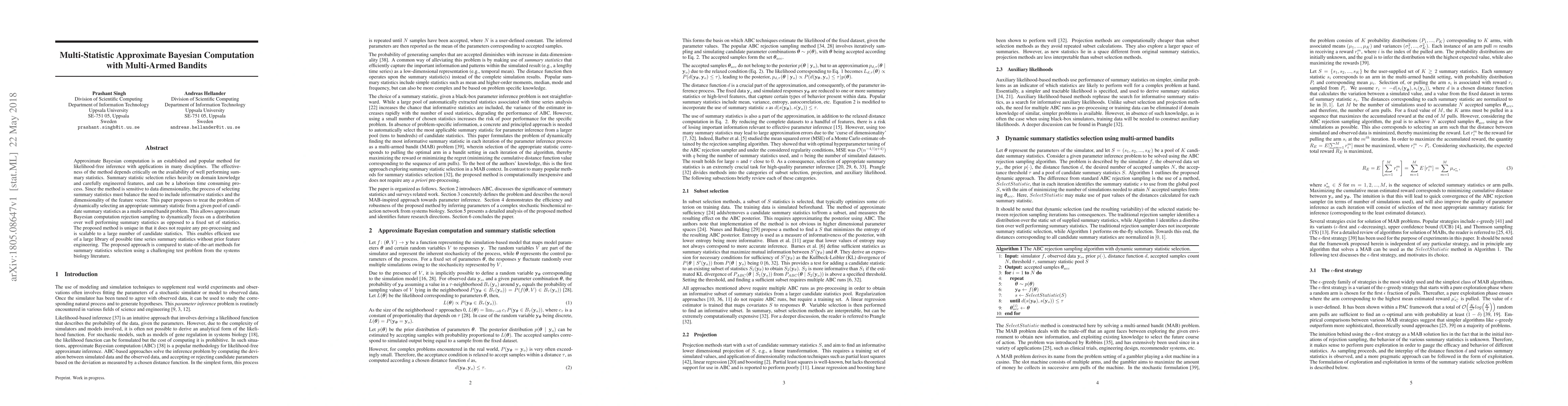 Approximate Bayesian computation is an established and popular method for likelihood-free inference with applications in many disciplines. The effectiveness of the method depends critically on the availability of well performing summary statistics. Summary statistic selection relies heavily on domain knowledge and carefully engineered features, and can be a laborious time consuming process. Since the method is sensitive to data dimensionality, the process of selecting summary statistics must balance the need to include informative statistics and the dimensionality of the feature vector. This paper proposes to treat the problem of dynamically selecting an appropriate summary statistic from a given pool of candidate summary statistics as a multi-armed bandit problem. This allows approximate Bayesian computation rejection sampling to dynamically focus on a distribution over well performing summary statistics as opposed to a fixed set of statistics. The proposed method is unique in that it does not require any pre-processing and is scalable to a large number of candidate statistics. This enables efficient use of a large library of possible time series summary statistics without prior feature engineering. The proposed approach is compared to state-of-the-art methods for summary statistics selection using a challenging test problem from the systems biology literature.