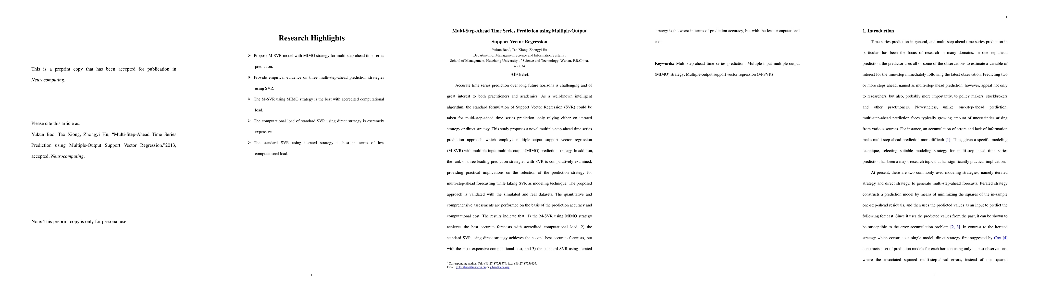 This paper proposes a multiple-output support vector regression (M-SVR) approach for multi-step-ahead time series prediction using a multiple-input multiple-output (MIMO) strategy, demonstrating superior prediction accuracy and manageable computational cost compared to standard SVR methods. The comparative analysis highlights the MIMO strategy's effectiveness for long-horizon forecasting.