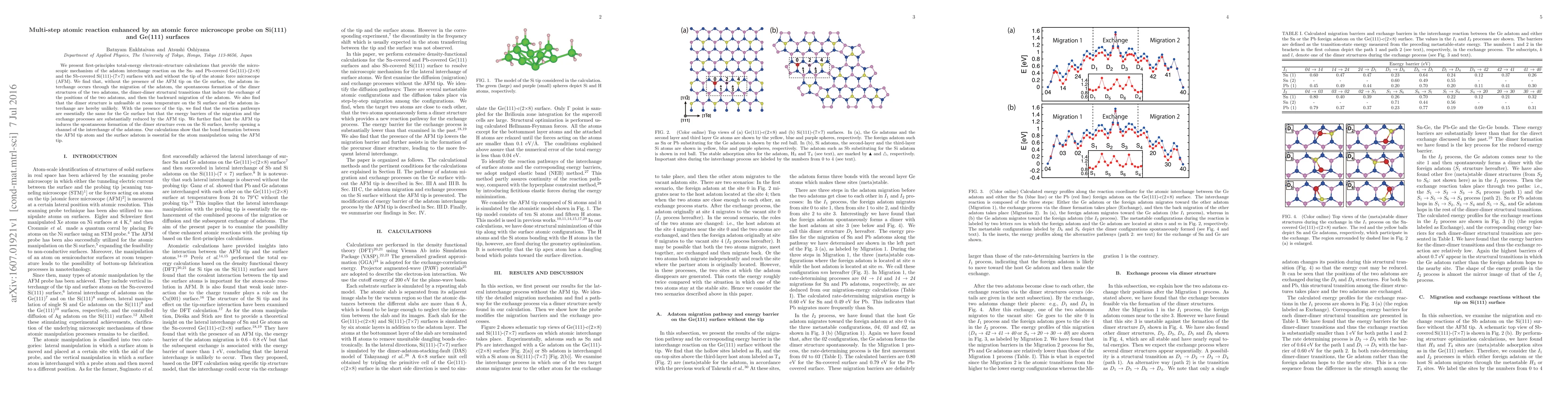 We present first-principles total-energy electronic-structure calculations that provide the microscopic mechanism of the adatom interchange reaction on the Sn- and Pb-covered Ge(111)-(2x8) and the Sb-covered Si(111)-(7x7) surfaces with and without the tip of the atomic force microscope (AFM). We find that, without the presence of the AFM tip on the Ge surface, the adatom interchange occurs through the migration of the adatom, the spontaneous formation of the dimer structures of the two adatoms, the dimer-dimer structural transitions that induce the exchange of the positions of the two adatoms, and then the backward migration of the adatom. We also find that the dimer structure is unfeasible at room temperature on the Si surface and the adatom interchange are hereby unlikely. With the presence of the tip, we find that the reaction pathways are essentially the same for the Ge surface but that the energy barriers of the migration and the exchange processes are substantially reduced by the AFM tip. We further find that the AFM tip induces the spontaneous formation of the dimer structure even on the Si surface, hereby opening a channel of the interchange of the adatoms. Our calculations show that the bond formation between the AFM tip atom and the surface adatom is essential for the atom manipulation using the AFM tip.