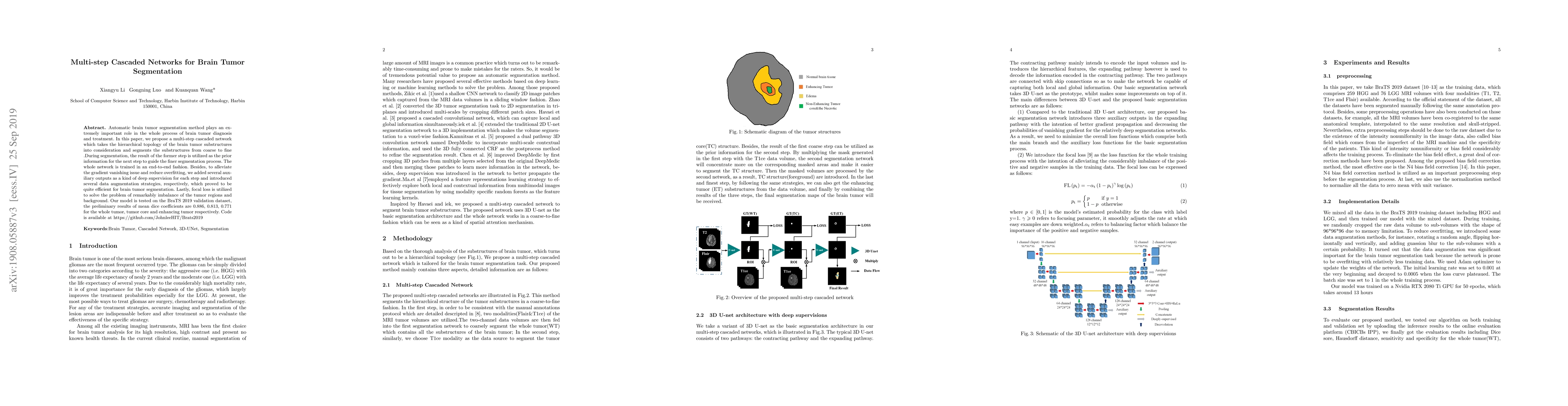 This paper proposes a multi-step cascaded network for brain tumor segmentation that segments tumor substructures from coarse to fine, utilizing prior information from each step. The network includes deep supervision and data augmentation to mitigate gradient vanishing and overfitting, and focal loss addresses the imbalance of tumor regions. Preliminary results show mean dice coefficients of 0.886, 0.813, and 0.771 for whole tumor, tumor core, and enhancing tumor respectively.