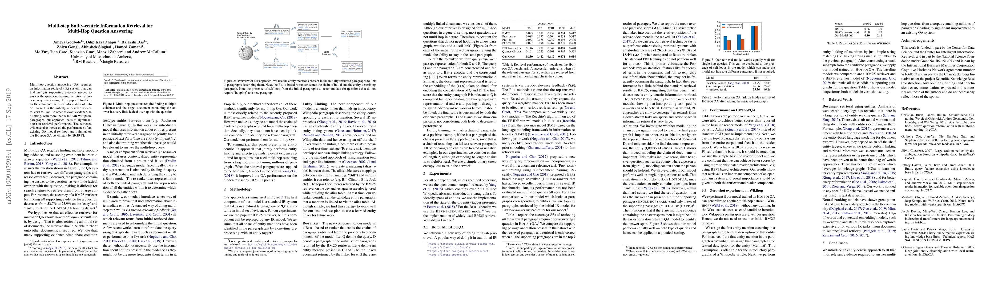 This paper proposes an entity-centric information retrieval technique for multi-hop question answering, leveraging initial evidence to find subsequent relevant information, achieving a notable performance boost in a large Wikipedia dataset and improving an existing QA model's F1 score by 10.59 on the hotpot benchmark.