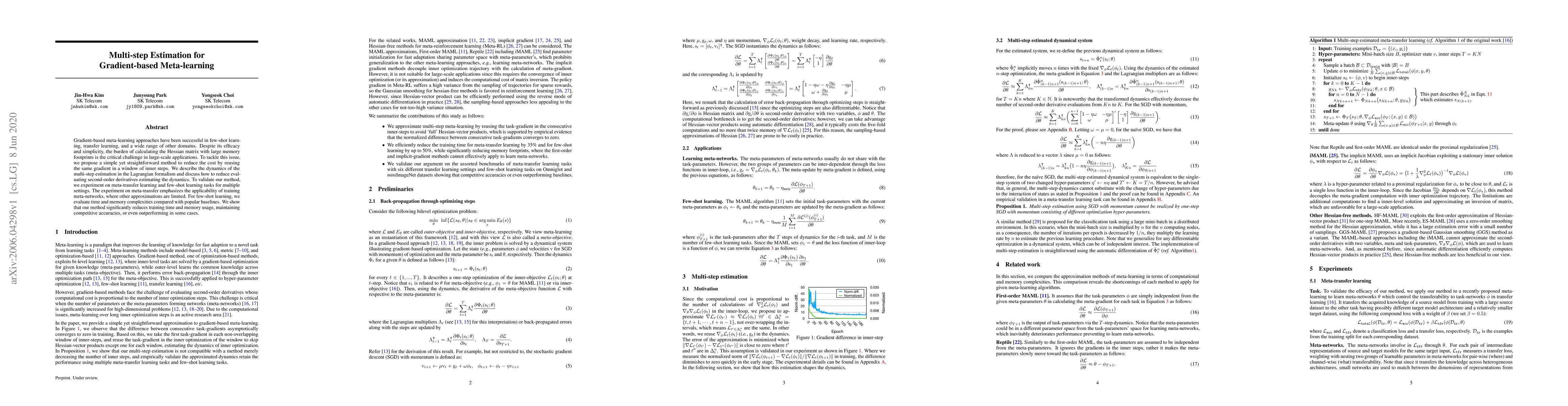 This paper proposes a multi-step estimation method to reduce the computational cost of gradient-based meta-learning, particularly addressing the memory footprint issue of Hessian matrix calculations. The method reuses the same gradient over a window of inner steps, significantly lowering training time and memory usage while maintaining or improving accuracy in few-shot and meta-transfer learning tasks.