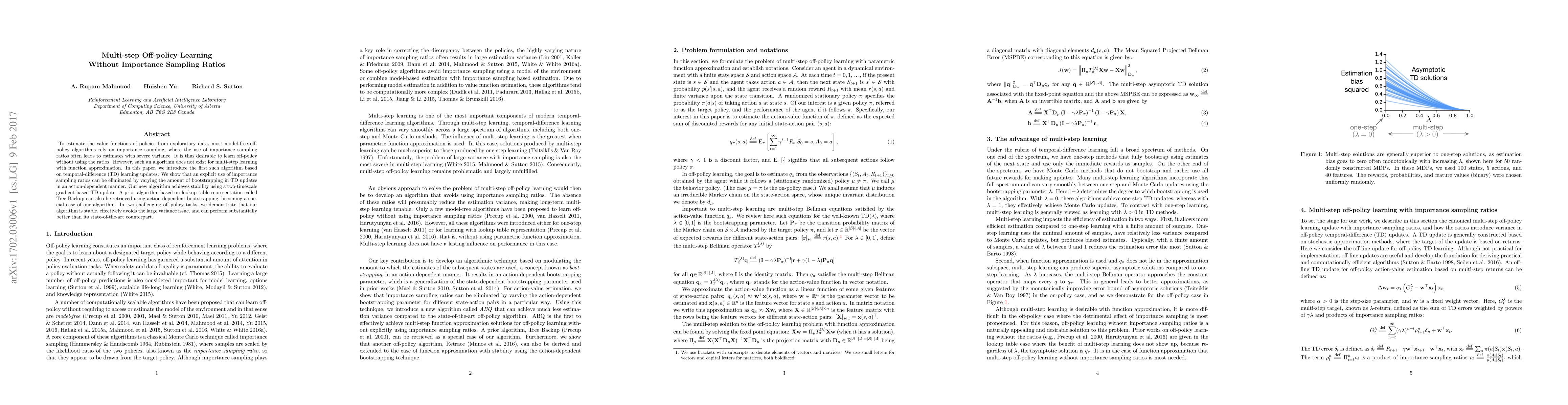 This paper introduces a novel multi-step off-policy learning algorithm that eliminates the use of importance sampling ratios, addressing the high variance issue. The proposed algorithm leverages action-dependent bootstrapping in temporal-difference updates, achieving stability through a two-timescale gradient-based approach, and outperforms state-of-the-art methods in off-policy tasks.