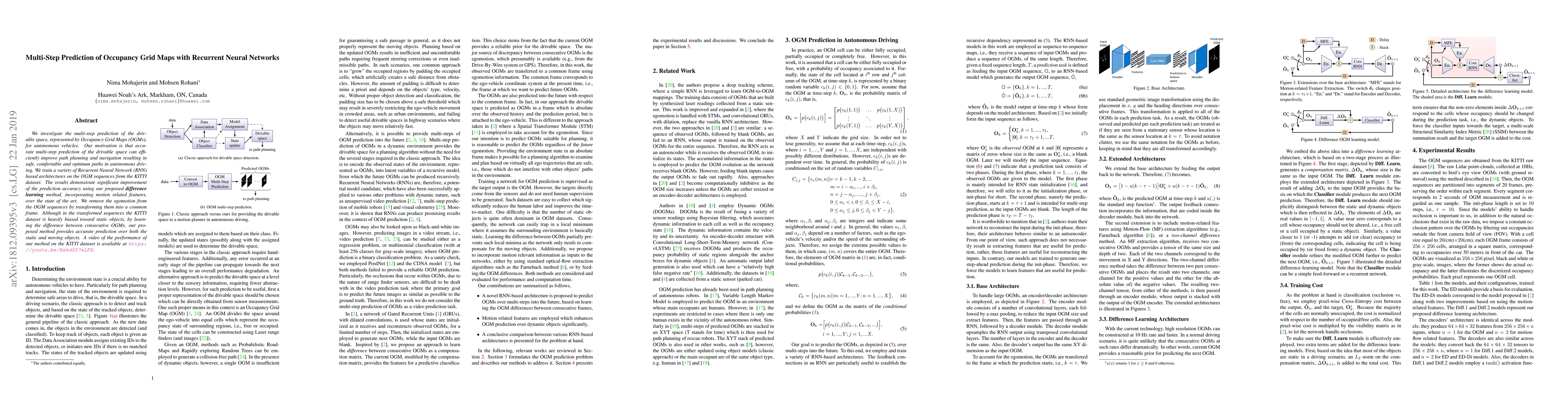 This paper explores the use of Recurrent Neural Networks (RNNs) to predict Occupancy Grid Maps (OGMs) for multi-step path planning in autonomous vehicles. The proposed difference learning method, which incorporates motion features, significantly improves prediction accuracy over existing methods, effectively handling both static and dynamic objects despite dataset biases.