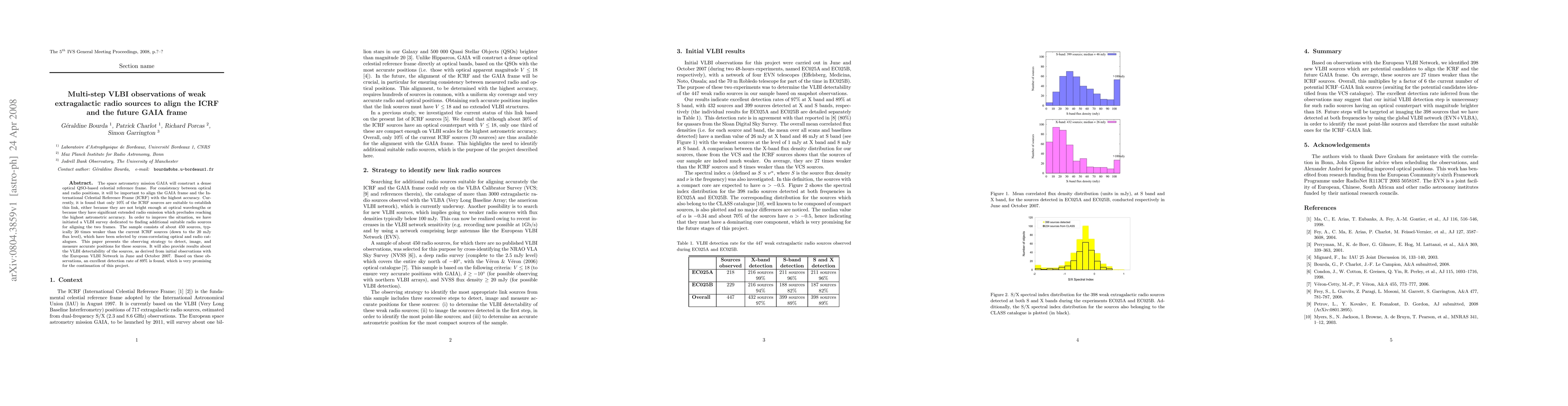 The research employs multi-step VLBI observations targeting weak extragalactic radio sources to align the ICRF and the future GAIA frame. The sample consists of approximately 450 sources, selected by cross-correlating optical and radio catalogs, with flux levels down to 20 mJy.