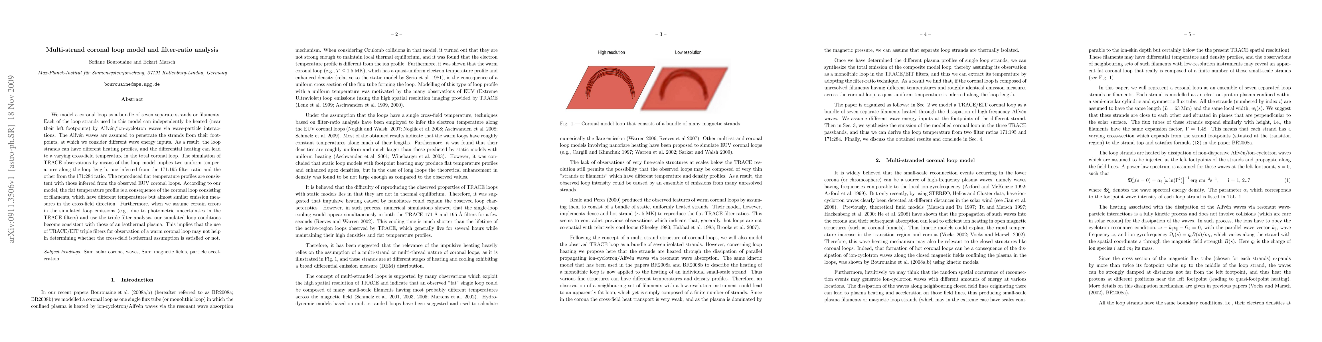 We model a coronal loop as a bundle of seven separate strands or filaments. Each of the loop strands used in this model can independently be heated (near their left footpoints) by Alfv\'en/ion-cyclotron waves via wave-particle interactions. The Alfv\'en waves are assumed to penetrate the strands from their footpoints, at which we consider different wave energy inputs. As a result, the loop strands can have different heating profiles, and the differential heating can lead to a varying cross-field temperature in the total coronal loop. The simulation of TRACE observations by means of this loop model implies two uniform temperatures along the loop length, one inferred from the 171:195 filter ratio and the other from the 171:284 ratio. The reproduced flat temperature profiles are consistent with those inferred from the observed EUV coronal loops. According to our model, the flat temperature profile is a consequence of the coronal loop consisting of filaments, which have different temperatures but almost similar emission measures in the cross-field direction. Furthermore, when we assume certain errors in the simulated loop emissions (e.g., due to photometric uncertainties in the TRACE filters) and use the triple-filter analysis, our simulated loop conditions become consistent with those of an isothermal plasma. This implies that the use of TRACE/EIT triple filters for observation of a warm coronal loop may not help in determining whether the cross-field isothermal assumption is satisfied or not.