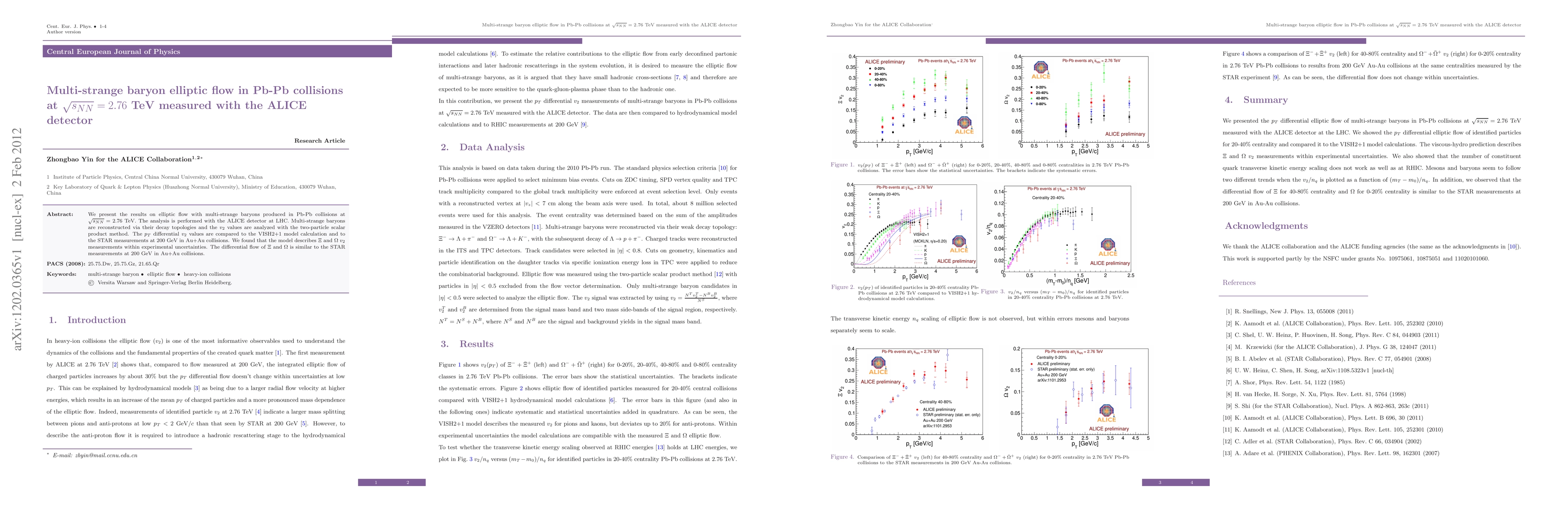 We present the results on elliptic flow with multi-strange baryons produced in Pb-Pb collisions at \sqrt{s_{NN}} = 2.76 TeV. The analysis is performed with the ALICE detector at LHC. Multi-strange baryons are reconstructed via their decay topologies and the v_2 values are analyzed with the two-particle scalar product method. The p_T differential v_2 values are compared to the VISH2+1 model calculation and to the STAR measurements at 200 GeV in Au+Au collisions. We found that the model describes \Xi and \Omega v_2 measurements within experimental uncertainties. The differential flow of \Xi and \Omega is similar to the STAR measurements at 200 GeV in Au+Au collisions.