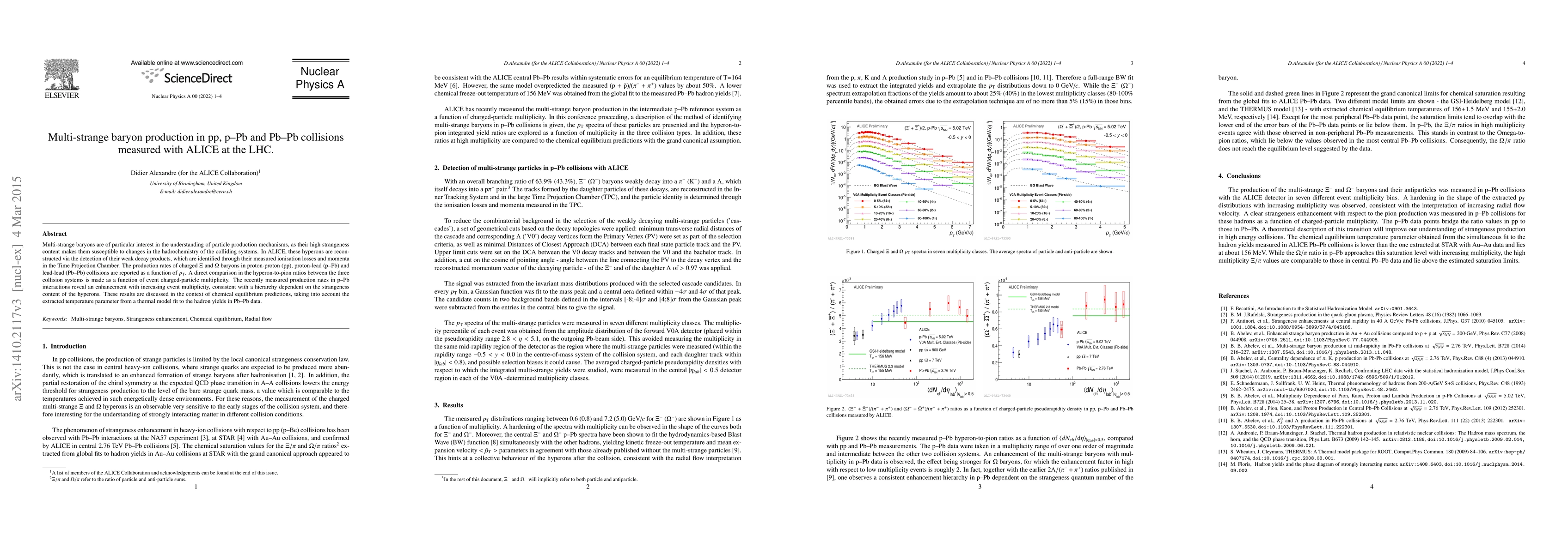 This paper reports on the production rates of multi-strange baryons ($\Xi$ and $\Omega$) in pp, p-Pb, and Pb-Pb collisions measured by ALICE at the LHC, revealing an enhancement in p-Pb interactions correlated with event multiplicity. The findings are discussed in relation to chemical equilibrium predictions and thermal model fits.