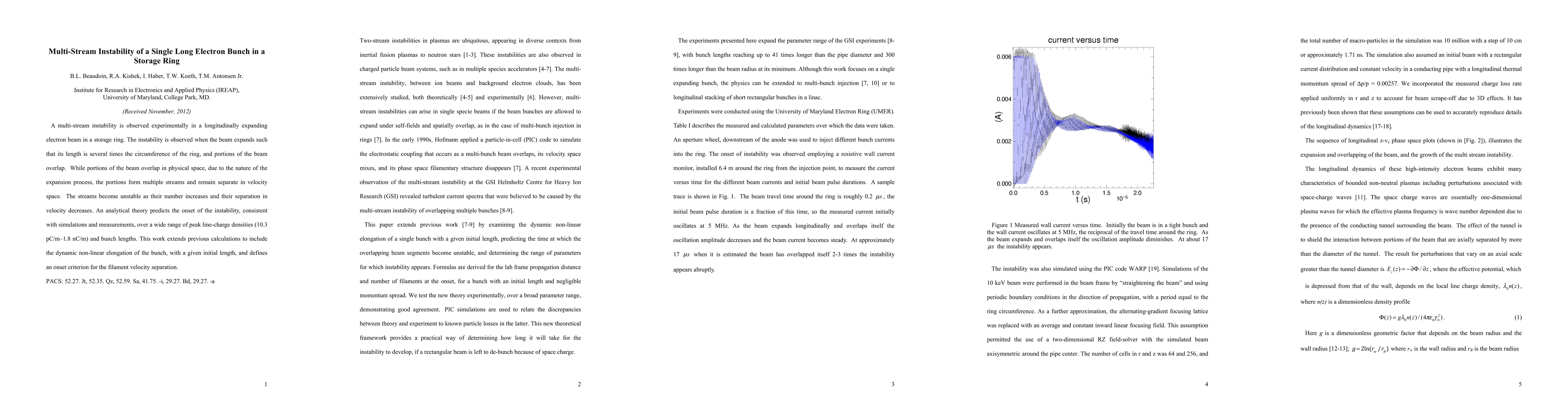 A multi-stream instability is observed experimentally in a longitudinally expanding electron beam in a storage ring. The instability is observed when the beam expands such that its length is several times the circumference of the ring, and portions of the beam overlap. While portions of the beam overlap in physical space, due to the nature of the expansion process, the portions form multiple streams and remain separate in velocity space. The streams become unstable as their number increases and their separation in velocity decreases. An analytical theory predicts the onset of the instability, consistent with simulations and measurements, over a wide range of peak line-charge densities and bunch lengths. This work extends previous calculations to include the dynamic non-linear elongation of the bunch, with a given initial length, and defines an onset criterion for the filament velocity separation.
