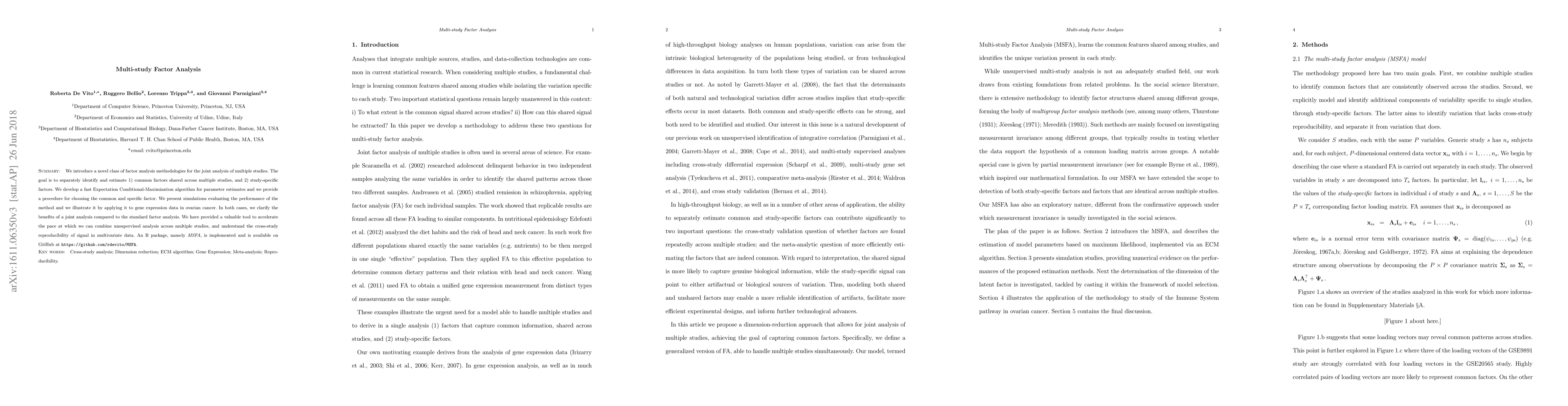 We introduce a novel class of factor analysis methodologies for the joint analysis of multiple studies. The goal is to separately identify and estimate 1) common factors shared across multiple studies, and 2) study-specific factors. We develop a fast Expectation Conditional-Maximization algorithm for parameter estimates and we provide a procedure for choosing the common and specific factor. We present simulations evaluating the performance of the method and we illustrate it by applying it to gene expression data in ovarian cancer. In both cases, we clarify the benefits of a joint analysis compared to the standard factor analysis. We hope to have provided a valuable tool to accelerate the pace at which we can combine unsupervised analysis across multiple studies, and understand the cross-study reproducibility of signal in multivariate data.