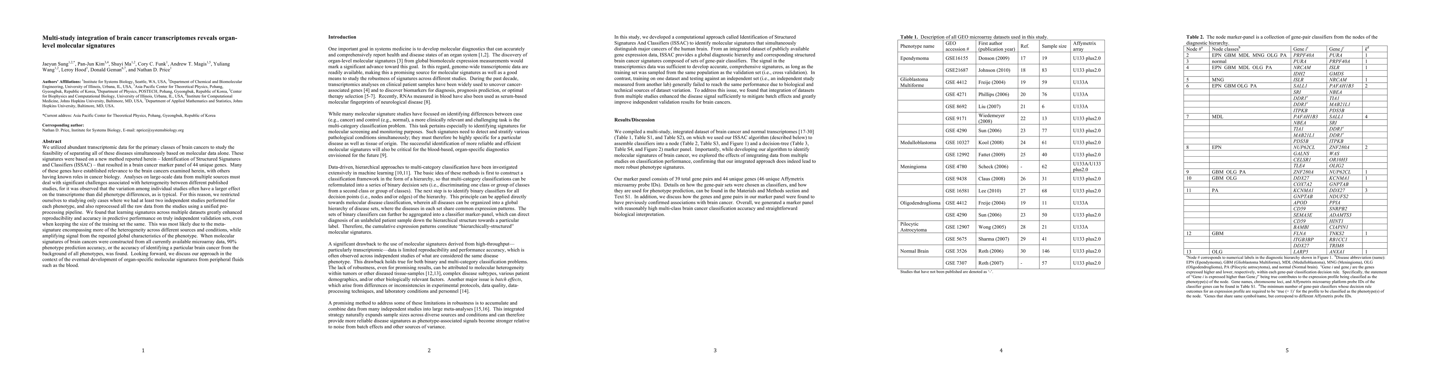 This study integrates transcriptomic data from various brain cancer types to identify a molecular signature panel of 44 genes, enhancing reproducibility and accuracy in predicting cancer types across diverse datasets. The approach demonstrates 90 percent accuracy in phenotype prediction, suggesting potential for developing organ-specific molecular signatures from peripheral fluids.