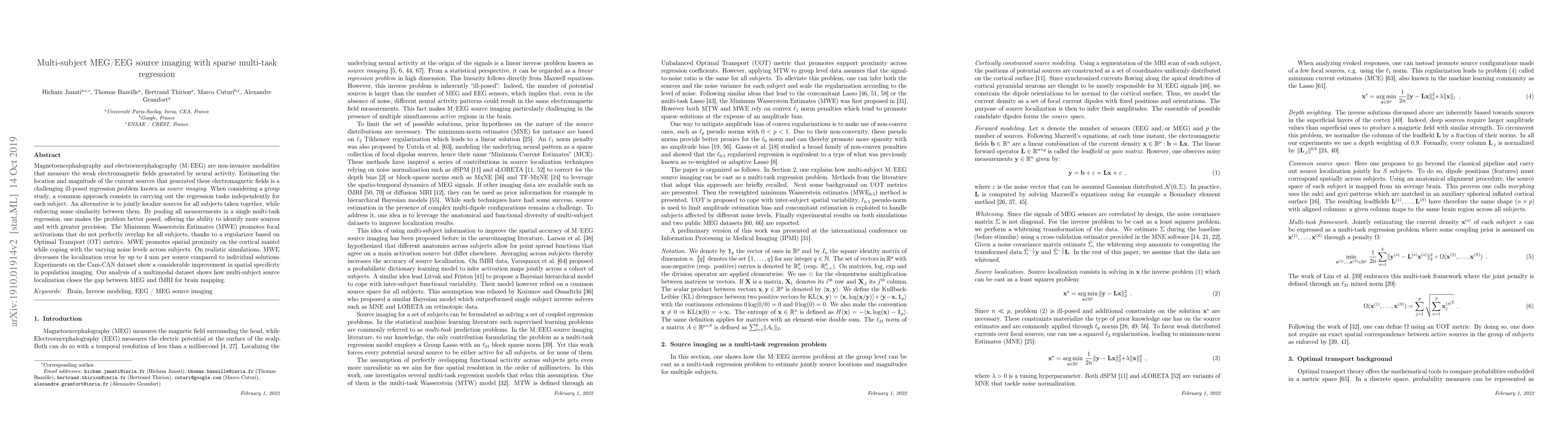 This paper proposes a Minimum Wasserstein Estimates (MWE) method for multi-subject MEG/EEG source imaging using sparse multi-task regression, which improves localization accuracy by enforcing similarity across subjects. MWE, based on Optimal Transport metrics, enhances spatial specificity and reduces localization error compared to individual subject approaches.