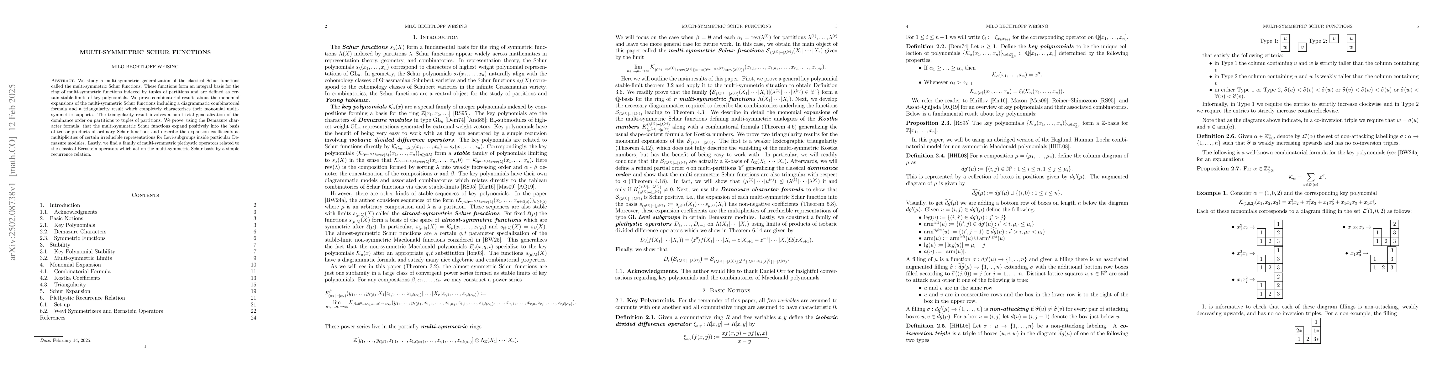 We study a multi-symmetric generalization of the classical Schur functions called the multi-symmetric Schur functions. These functions form an integral basis for the ring of multi-symmetric functions indexed by tuples of partitions and are defined as certain stable-limits of key polynomials. We prove combinatorial results about the monomial expansions of the multi-symmetric Schur functions including a diagrammatic combinatorial formula and a triangularity result which completely characterizes their monomial multi-symmetric supports. The triangularity result involves a non-trivial generalization of the dominance order on partitions to tuples of partitions. We prove, using the Demazure character formula, that the multi-symmetric Schur functions expand positively into the basis of tensor products of ordinary Schur functions and describe the expansion coefficients as multiplicities of certain irreducible representations for Levi subgroups inside particular Demazure modules. Lastly, we find a family of multi-symmetric plethystic operators related to the classical Bernstein operators which act on the multi-symmetric Schur basis by a simple recurrence relation.
