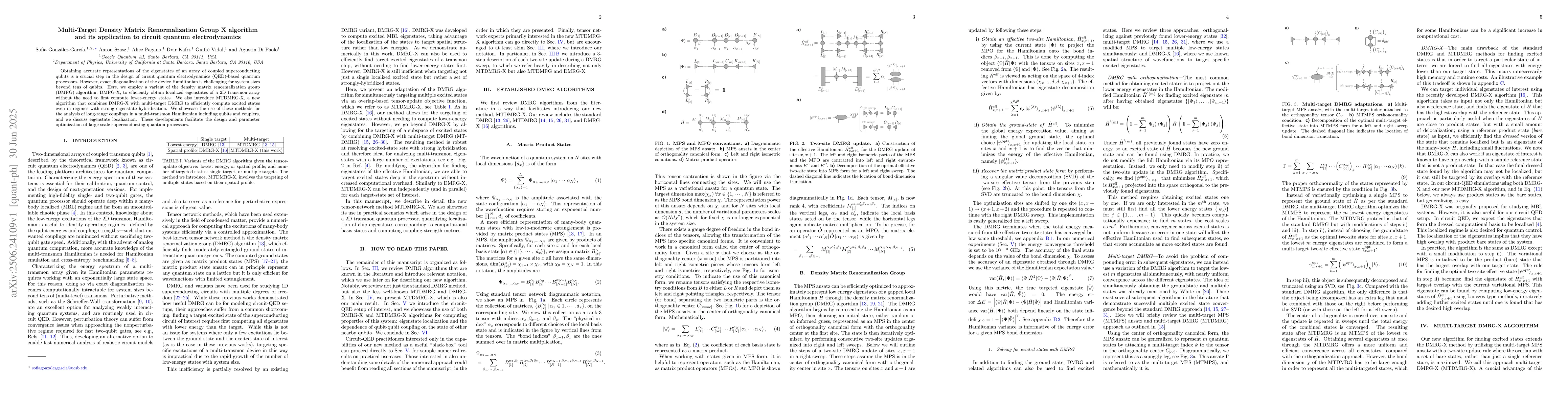 Obtaining accurate representations of the eigenstates of an array of coupled superconducting qubits is a crucial step in the design of circuit quantum electrodynamics (QED)-based quantum processors. However, exact diagonalization of the device Hamiltonian is challenging for system sizes beyond tens of qubits. Here, we employ a variant of the density matrix renormalization group (DMRG) algorithm, DMRG-X, to efficiently obtain localized eigenstates of a 2D transmon array without the need to first compute lower-energy states. We also introduce MTDMRG-X, a new algorithm that combines DMRG-X with multi-target DMRG to efficiently compute excited states even in regimes with strong eigenstate hybridization. We showcase the use of these methods for the analysis of long-range couplings in a multi-transmon Hamiltonian including qubits and couplers, and we discuss eigenstate localization. These developments facilitate the design and parameter optimization of large-scale superconducting quantum processors.