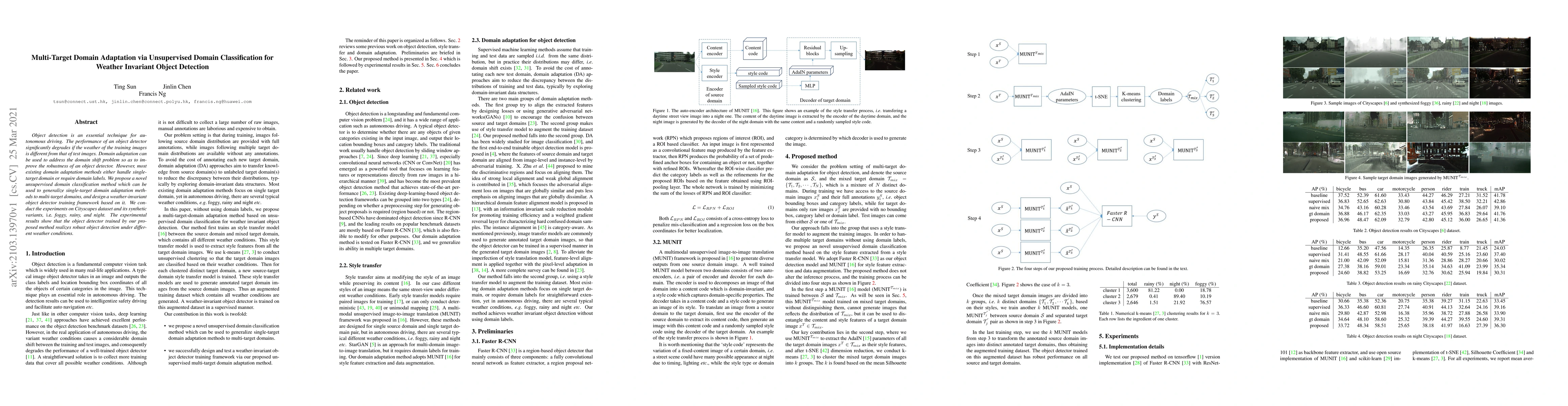 This paper proposes an unsupervised domain classification method for multi-target domain adaptation to improve the robustness of object detectors in varying weather conditions. Experiments on Cityscapes and synthetic weather variants show that the method effectively enhances weather-invariant object detection.