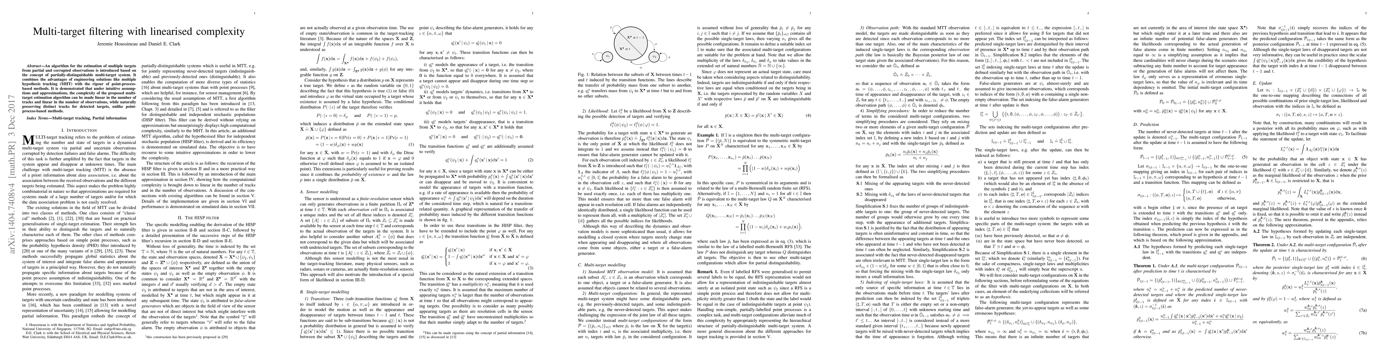 An algorithm for the estimation of multiple targets from partial and corrupted observations is introduced based on the concept of partially-distinguishable multi-target system. It combines the advantages of engineering solutions like MHT with the rigour of point-process-based methods. It is demonstrated that under intuitive assumptions and approximations, the complexity of the proposed multi-target estimation algorithm can be made linear in the number of tracks and linear in the number of observations, while naturally preserving distinct tracks for detected targets, unlike point-process-based methods.