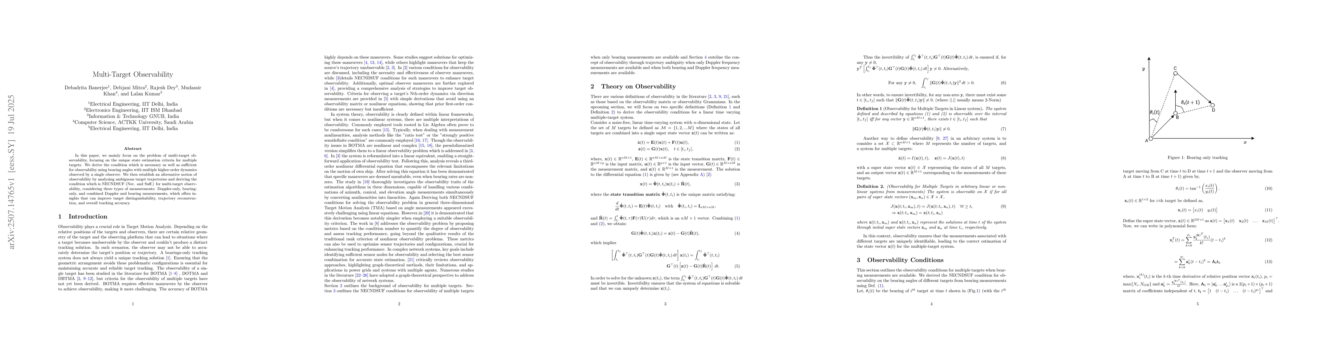 The paper derives conditions for multi-target observability using bearing angles with higher-order dynamics observed by a single entity, proposing an alternative observability notion based on ambiguous target trajectories.