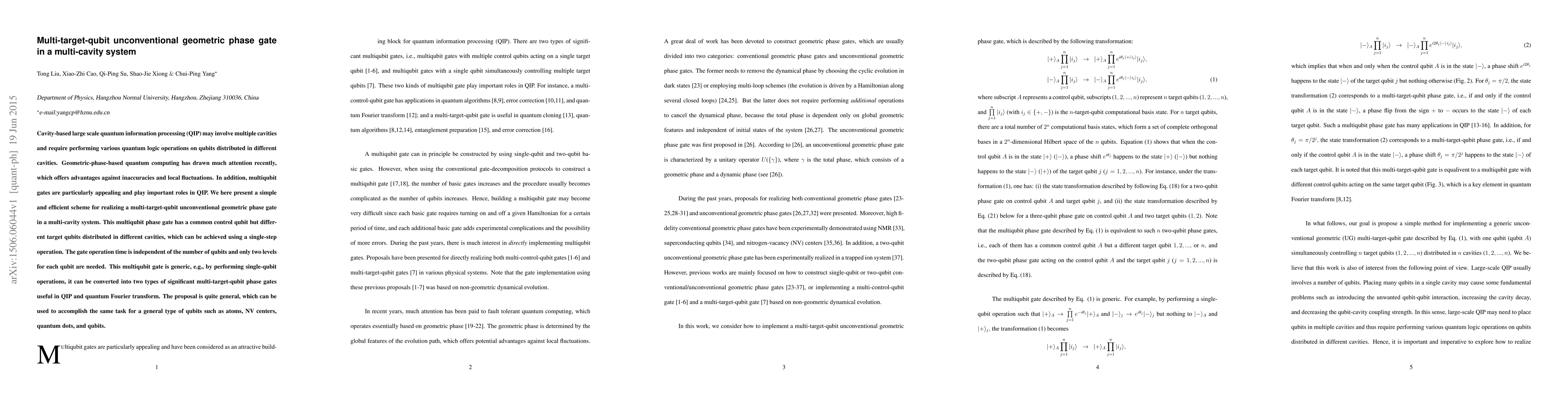 This paper proposes a simple and efficient scheme for a multi-target-qubit unconventional geometric phase gate in a multi-cavity quantum system, which can be achieved in a single-step operation with a gate operation time independent of the qubit count. The method is versatile and can be applied to various qubit types for quantum information processing.