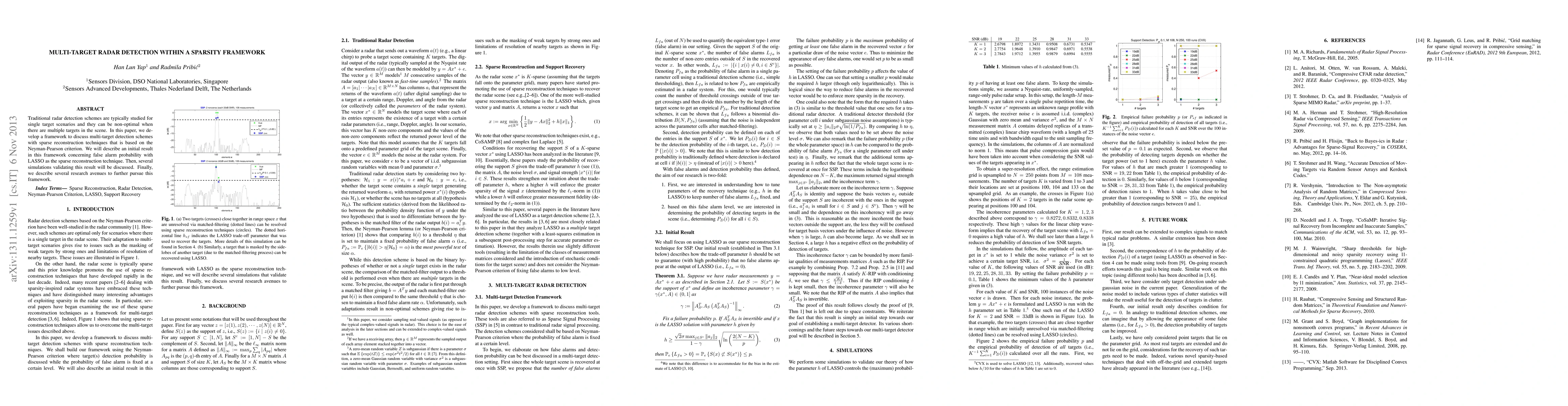 Traditional radar detection schemes are typically studied for single target scenarios and they can be non-optimal when there are multiple targets in the scene. In this paper, we develop a framework to discuss multi-target detection schemes with sparse reconstruction techniques that is based on the Neyman-Pearson criterion. We will describe an initial result in this framework concerning false alarm probability with LASSO as the sparse reconstruction technique. Then, several simulations validating this result will be discussed. Finally, we describe several research avenues to further pursue this framework.