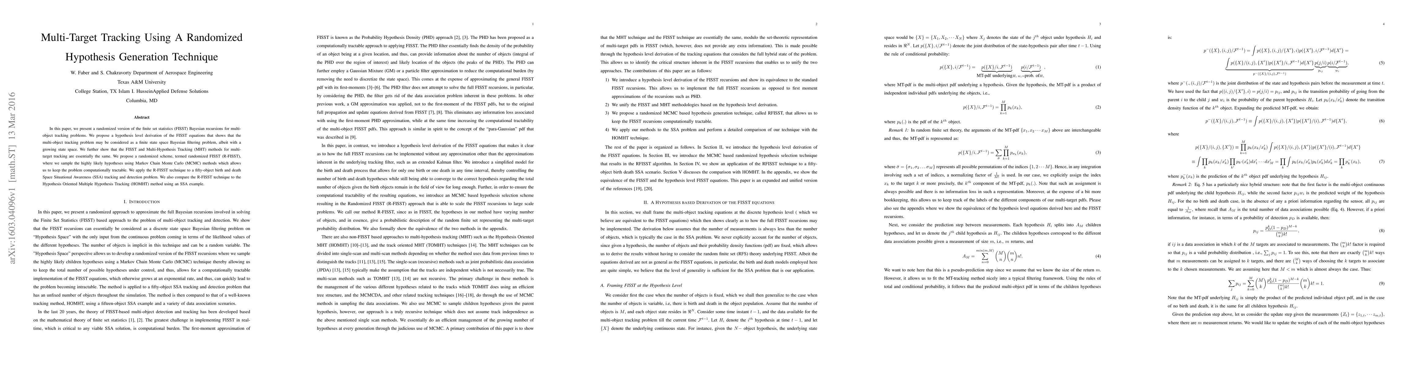 This paper introduces a randomized version of the FISST Bayesian recursions for multi-target tracking, proposing a Markov Chain Monte Carlo method to sample likely hypotheses, termed R-FISST, to maintain computational efficiency. The authors demonstrate the equivalence of FISST and MHT methods and apply R-FISST to a fifty-object SSA tracking scenario, comparing it to HOMHT.