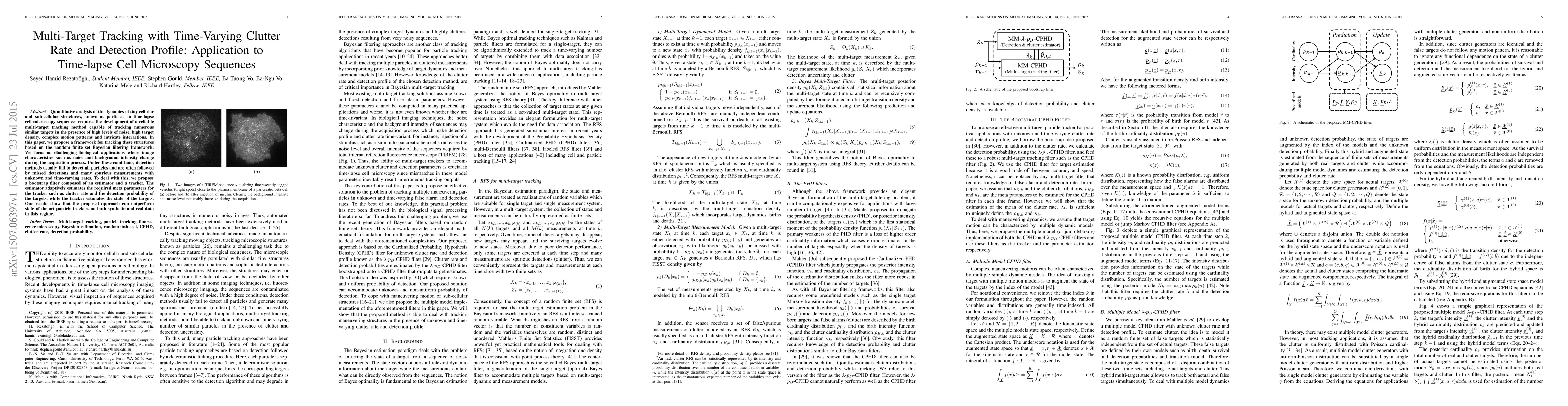 Quantitative analysis of the dynamics of tiny cellular and sub-cellular structures, known as particles, in time-lapse cell microscopy sequences requires the development of a reliable multi-target tracking method capable of tracking numerous similar targets in the presence of high levels of noise, high target density, complex motion patterns and intricate interactions. In this paper, we propose a framework for tracking these structures based on the random finite set Bayesian filtering framework. We focus on challenging biological applications where image characteristics such as noise and background intensity change during the acquisition process. Under these conditions, detection methods usually fail to detect all particles and are often followed by missed detections and many spurious measurements with unknown and time-varying rates. To deal with this, we propose a bootstrap filter composed of an estimator and a tracker. The estimator adaptively estimates the required meta parameters for the tracker such as clutter rate and the detection probability of the targets, while the tracker estimates the state of the targets. Our results show that the proposed approach can outperform state-of-the-art particle trackers on both synthetic and real data in this regime.