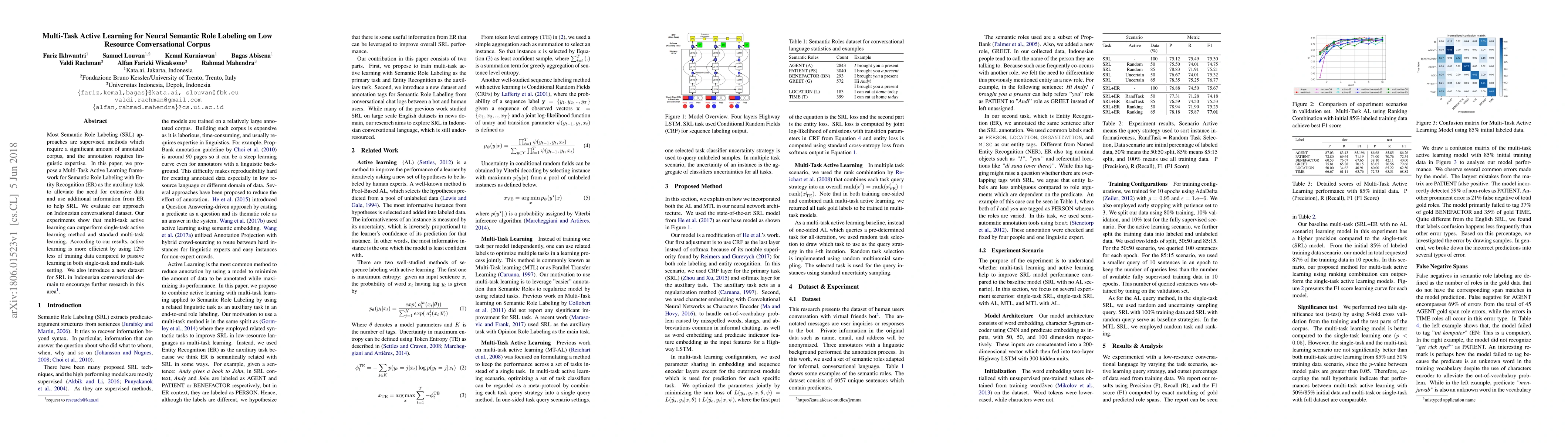 This paper proposes a Multi-Task Active Learning framework combining Semantic Role Labeling with Entity Recognition to reduce the need for extensive annotated data. Experiments on an Indonesian conversational dataset show improved performance and efficiency, requiring 12% less training data than passive learning.