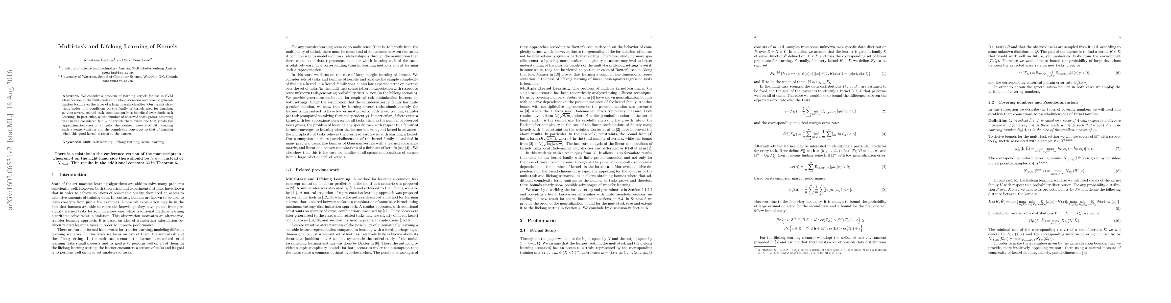 This paper explores multi-task and lifelong learning kernels for SVM classification, demonstrating that solving several related tasks together can be more efficient than single-task learning. It shows that as more tasks are observed, the advantage of multi-task learning converges to the performance of learning with the best kernel for all tasks.