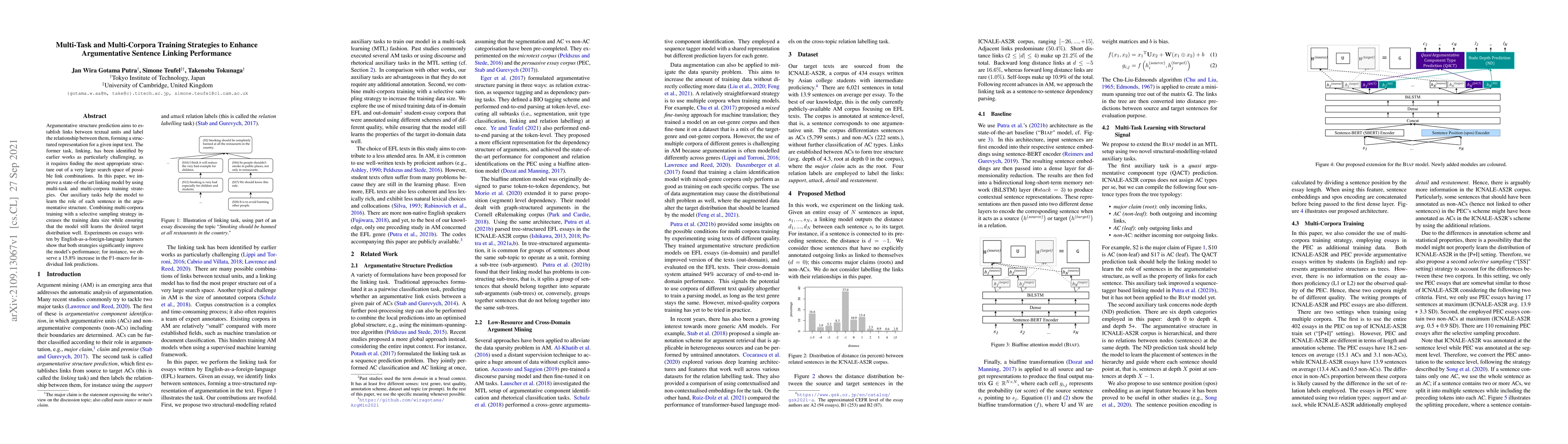 This paper enhances argumentative sentence linking performance using multi-task and multi-corpora training strategies. The proposed methods significantly improve the state-of-the-art model, achieving a 15.8% increase in F1-macro for link predictions in essays from English-as-a-foreign-language learners.