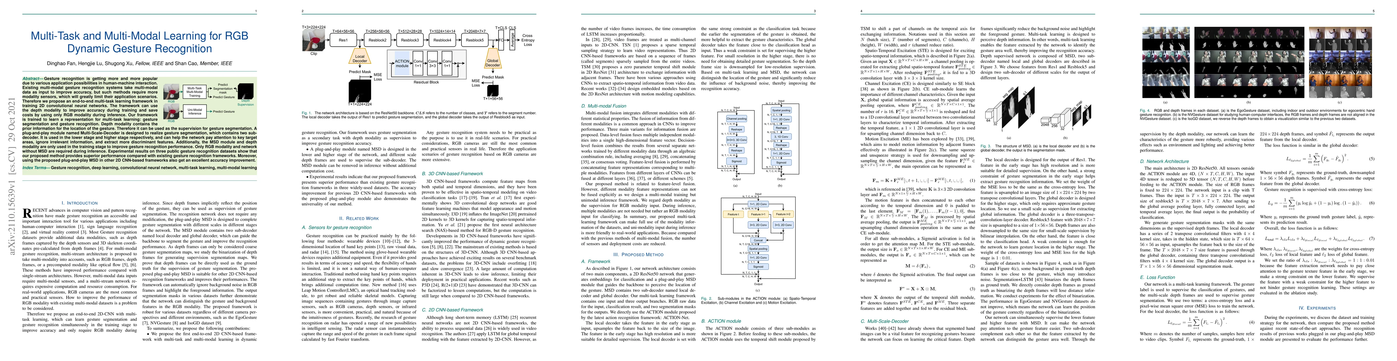 The paper proposes an end-to-end multi-task and multi-modal learning framework using 2D convolutional neural networks for RGB dynamic gesture recognition. It utilizes depth modality for improved accuracy during training and only RGB modality during inference, focusing on gesture segmentation and recognition.