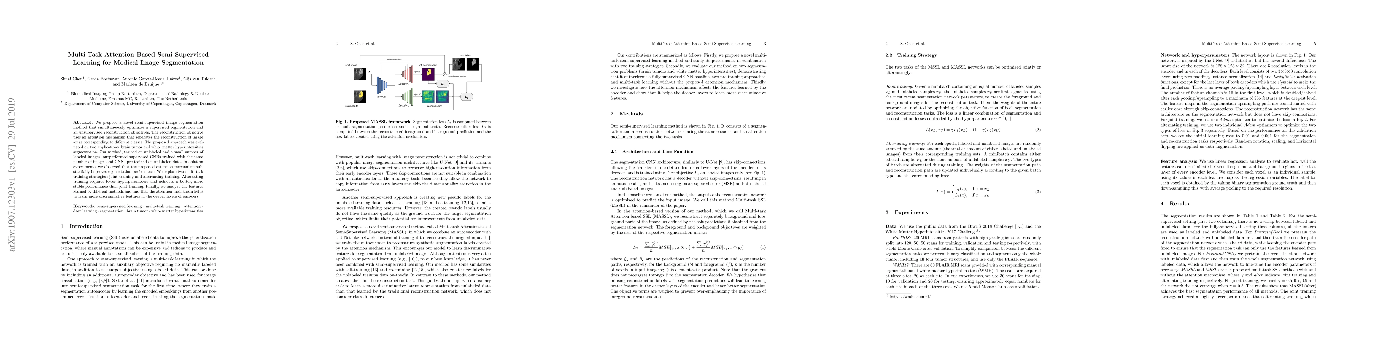 We propose a novel semi-supervised image segmentation method that simultaneously optimizes a supervised segmentation and an unsupervised reconstruction objectives. The reconstruction objective uses an attention mechanism that separates the reconstruction of image areas corresponding to different classes. The proposed approach was evaluated on two applications: brain tumor and white matter hyperintensities segmentation. Our method, trained on unlabeled and a small number of labeled images, outperformed supervised CNNs trained with the same number of images and CNNs pre-trained on unlabeled data. In ablation experiments, we observed that the proposed attention mechanism substantially improves segmentation performance. We explore two multi-task training strategies: joint training and alternating training. Alternating training requires fewer hyperparameters and achieves a better, more stable performance than joint training. Finally, we analyze the features learned by different methods and find that the attention mechanism helps to learn more discriminative features in the deeper layers of encoders.