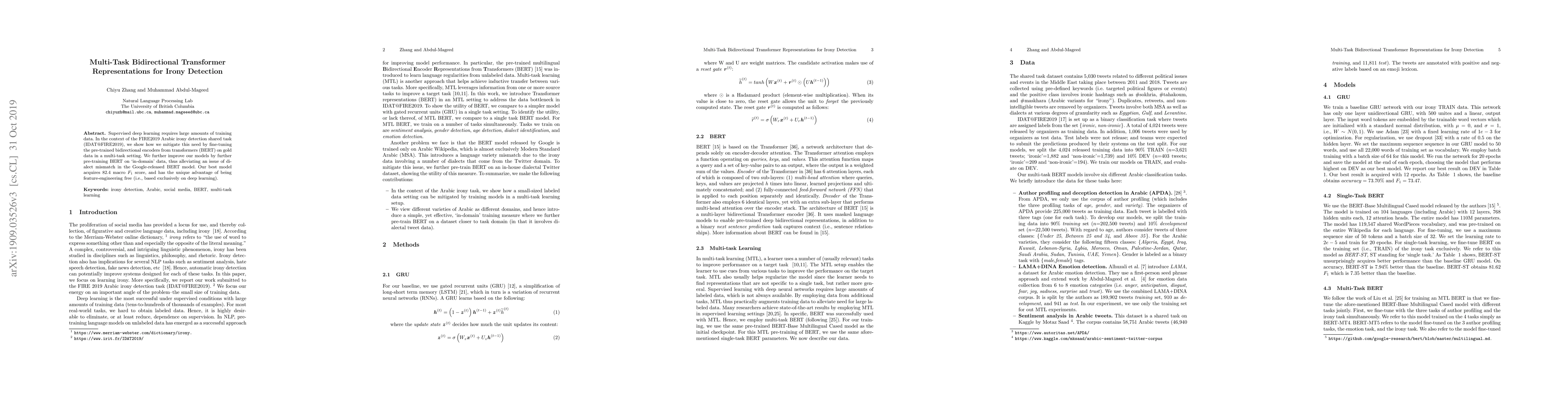 Supervised deep learning requires large amounts of training data. In the context of the FIRE2019 Arabic irony detection shared task (IDAT@FIRE2019), we show how we mitigate this need by fine-tuning the pre-trained bidirectional encoders from transformers (BERT) on gold data in a multi-task setting. We further improve our models by by further pre-training BERT on `in-domain' data, thus alleviating an issue of dialect mismatch in the Google-released BERT model. Our best model acquires 82.4 macro F1 score, and has the unique advantage of being feature-engineering free (i.e., based exclusively on deep learning).