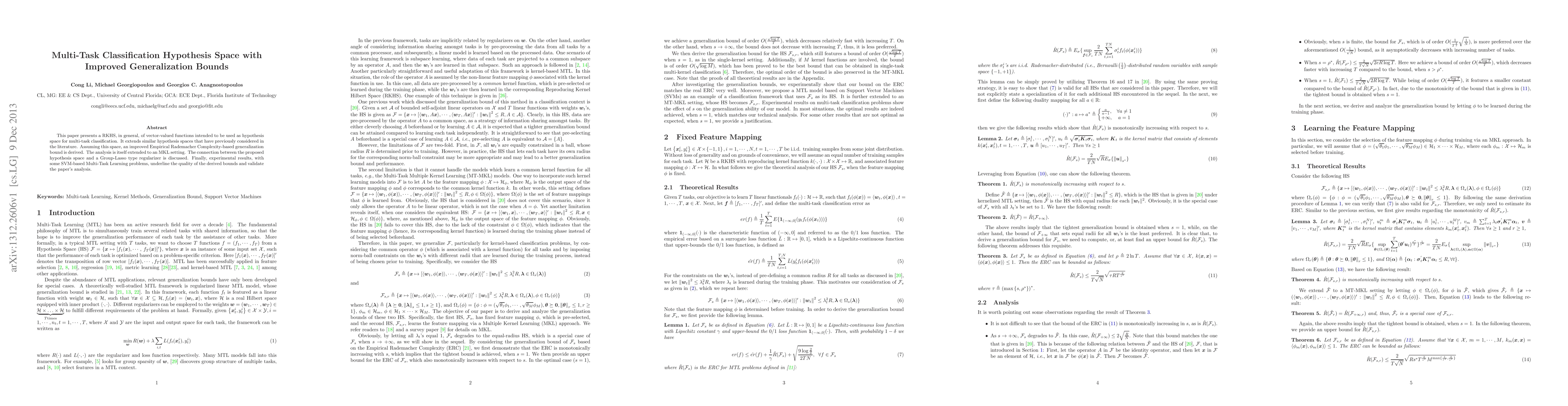 This paper presents a RKHS, in general, of vector-valued functions intended to be used as hypothesis space for multi-task classification. It extends similar hypothesis spaces that have previously considered in the literature. Assuming this space, an improved Empirical Rademacher Complexity-based generalization bound is derived. The analysis is itself extended to an MKL setting. The connection between the proposed hypothesis space and a Group-Lasso type regularizer is discussed. Finally, experimental results, with some SVM-based Multi-Task Learning problems, underline the quality of the derived bounds and validate the paper's analysis.
