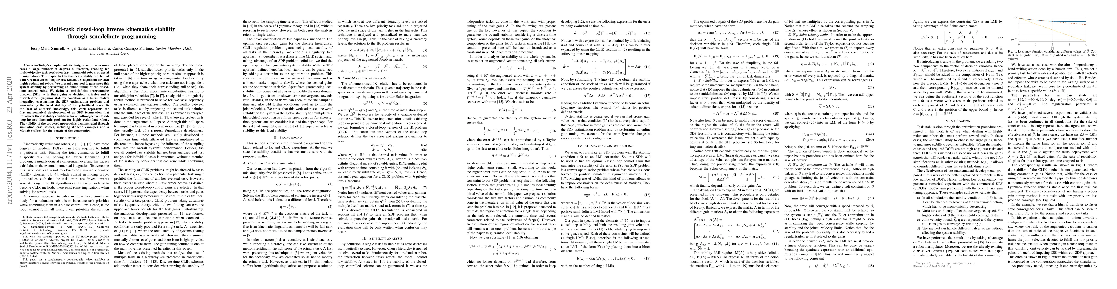 This paper proposes a method to ensure stability in closed-loop inverse kinematics for highly redundant robots using semi-definite programming, allowing for multi-objective task resolution.