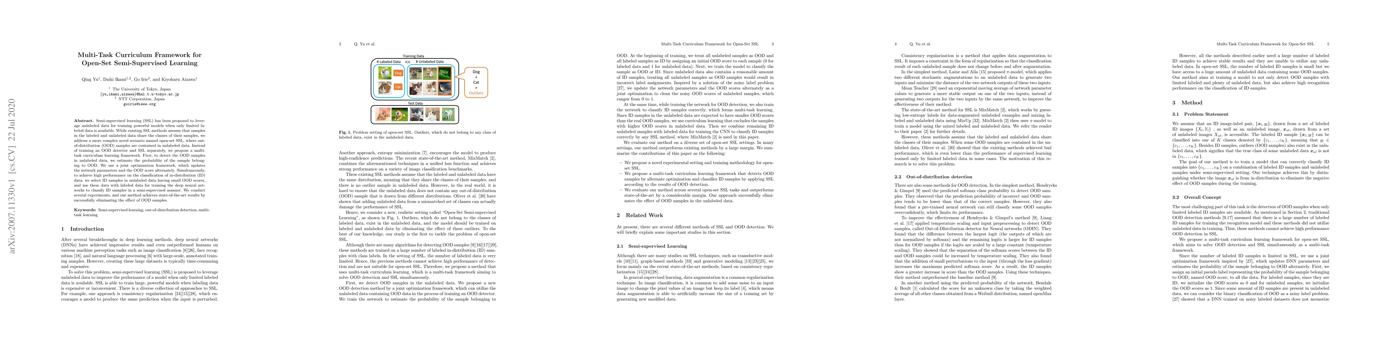 This paper proposes a multi-task curriculum framework for open-set semi-supervised learning, addressing scenarios where unlabeled data contains out-of-distribution samples. It integrates OOD detection and SSL training within a joint optimization approach, achieving state-of-the-art results by effectively mitigating OOD sample influence.
