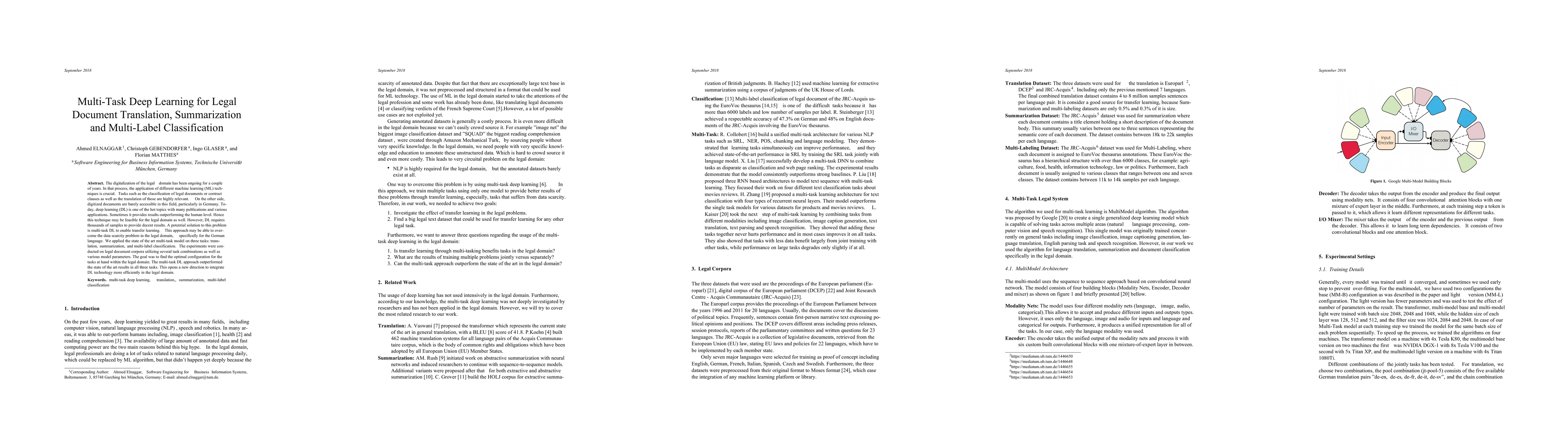 This research explores the application of multi-task deep learning for legal document translation, summarization, and multi-label classification, addressing the scarcity of data in the legal domain. The study demonstrates that multi-task deep learning outperforms existing methods, suggesting a promising approach to integrating deep learning in the legal field.